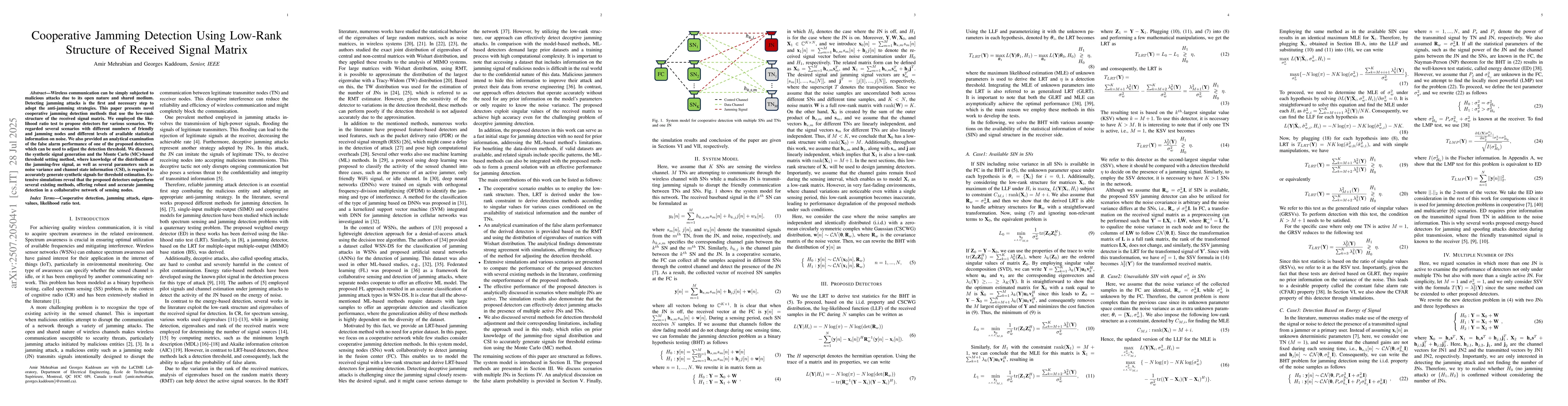 Wireless communication can be simply subjected to malicious attacks due to its open nature and shared medium. Detecting jamming attacks is the first and necessary step to adopt the anti-jamming strategies. This paper presents novel cooperative jamming detection methods that use the low-rank structure of the received signal matrix. We employed the likelihood ratio test to propose detectors for various scenarios. We regarded several scenarios with different numbers of friendly and jamming nodes and different levels of available statistical information on noise. We also provided an analytical examination of the false alarm performance of one of the proposed detectors, which can be used to adjust the detection threshold. We discussed the synthetic signal generation and the Monte Carlo (MC)-based threshold setting method, where knowledge of the distribution of the jamming-free signal, as well as several parameters such as noise variance and channel state information (CSI), is required to accurately generate synthetic signals for threshold estimation. Extensive simulations reveal that the proposed detectors outperform several existing methods, offering robust and accurate jamming detection in a collaborative network of sensing nodes.