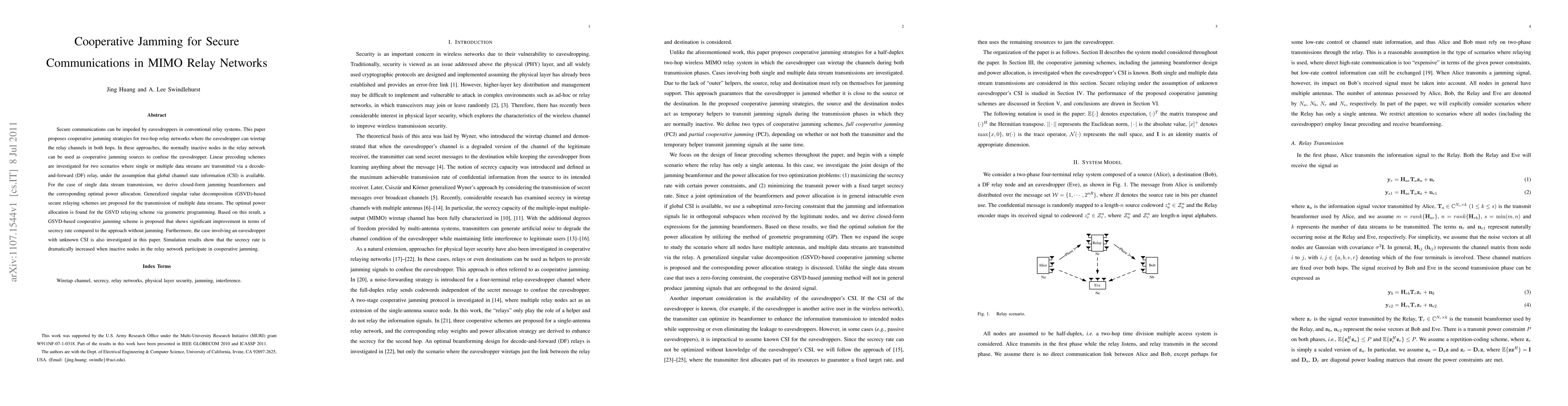 The paper presents linear precoding schemes for cooperative jamming in MIMO relay networks, deriving closed-form jamming beamformers and optimal power allocation techniques, along with GSVD-based secure relaying schemes for multiple data streams.