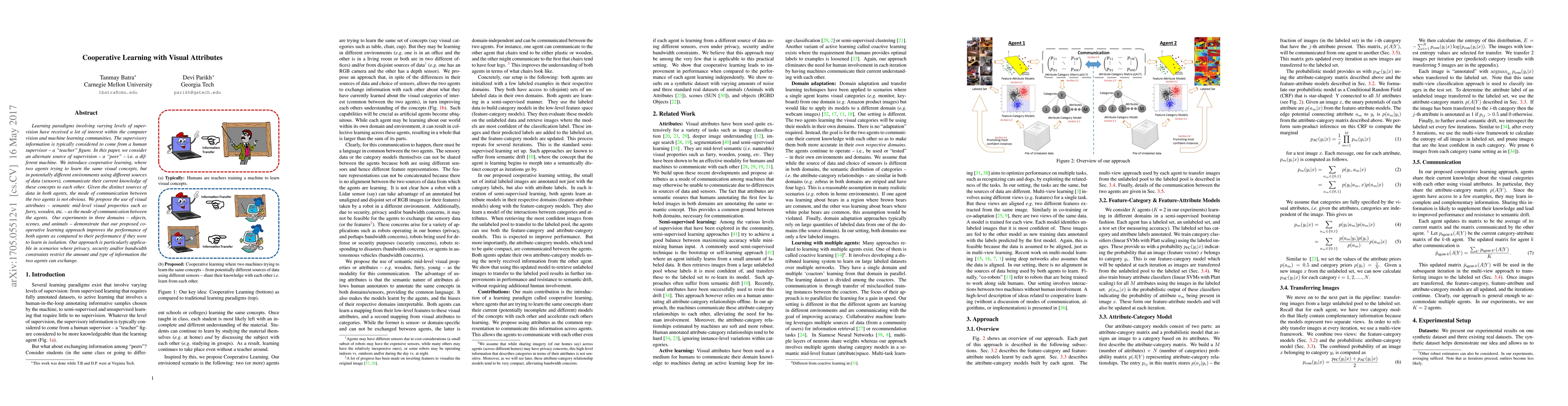 Researchers propose a new approach to cooperative learning where agents share visual attributes to improve performance in three domains: objects, scenes, and animals. This method overcomes data source limitations, especially in scenarios with privacy or bandwidth constraints.