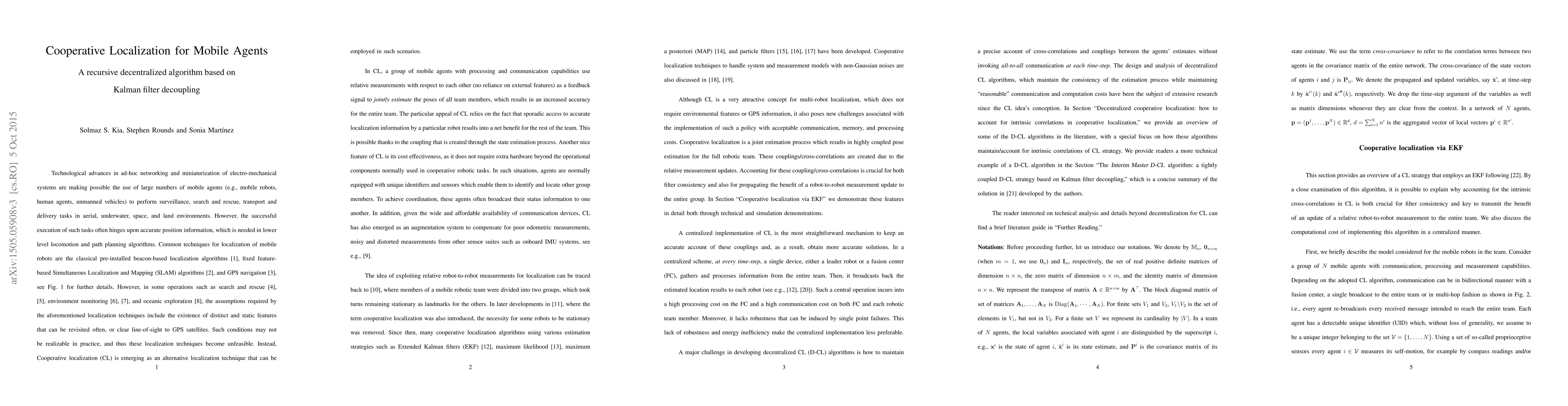 We consider cooperative localization technique for mobile agents with communication and computation capabilities. We start by provide and overview of different decentralization strategies in the literature, with special focus on how these algorithms maintain an account of intrinsic correlations between state estimate of team members. Then, we present a novel decentralized cooperative localization algorithm that is a decentralized implementation of a centralized Extended Kalman Filter for cooperative localization. In this algorithm, instead of propagating cross-covariance terms, each agent propagates new intermediate local variables that can be used in an update stage to create the required propagated cross-covariance terms. Whenever there is a relative measurement in the network, the algorithm declares the agent making this measurement as the interim master. By acquiring information from the interim landmark, the agent the relative measurement is taken from, the interim master can calculate and broadcast a set of intermediate variables which each robot can then use to update its estimates to match that of a centralized Extended Kalman Filter for cooperative localization. Once an update is done, no further communication is needed until the next relative measurement.