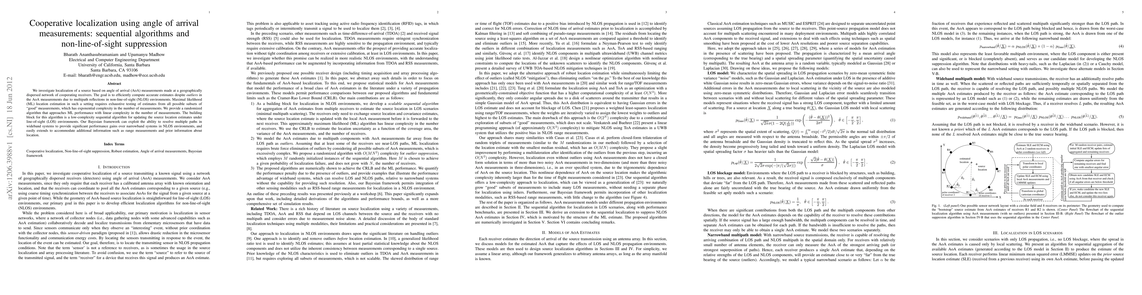 We investigate localization of a source based on angle of arrival (AoA) measurements made at a geographically dispersed network of cooperating receivers. The goal is to efficiently compute accurate estimates despite outliers in the AoA measurements due to multipath reflections in non-line-of-sight (NLOS) environments. Maximal likelihood (ML) location estimation in such a setting requires exhaustive testing of estimates from all possible subsets of "good" measurements, which has exponential complexity in the number of measurements. We provide a randomized algorithm that approaches ML performance with linear complexity in the number of measurements. The building block for this algorithm is a low-complexity sequential algorithm for updating the source location estimates under line-of-sight (LOS) environments. Our Bayesian framework can exploit the ability to resolve multiple paths in wideband systems to provide significant performance gains over narrowband systems in NLOS environments, and easily extends to accommodate additional information such as range measurements and prior information about location.