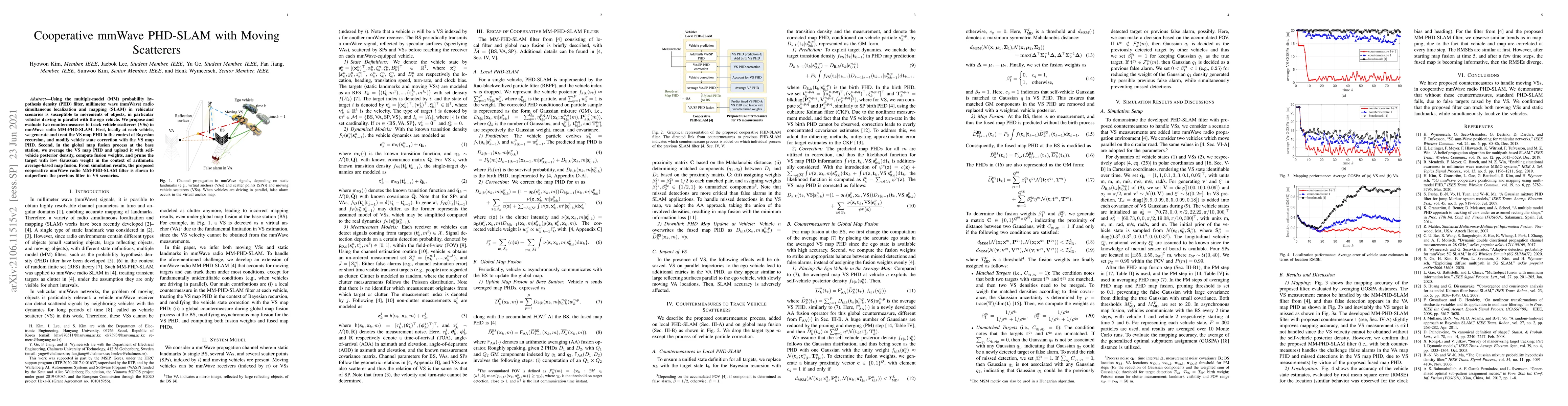 This paper proposes two countermeasures for mmWave radio MM-PHD-SLAM to track moving scatterers in vehicular environments. The methods include local VS map PHD generation and global map fusion with arithmetic average-based pruning, which improve tracking performance over previous filters.