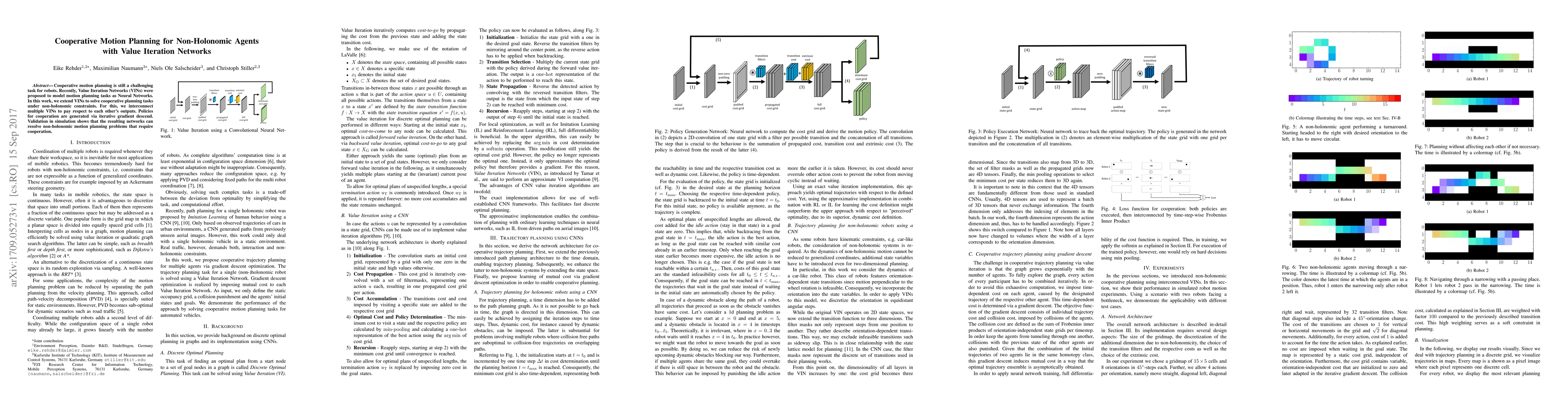 Cooperative motion planning is still a challenging task for robots. Recently, Value Iteration Networks (VINs) were proposed to model motion planning tasks as Neural Networks. In this work, we extend VINs to solve cooperative planning tasks under non-holonomic constraints. For this, we interconnect multiple VINs to pay respect to each other's outputs. Policies for cooperation are generated via iterative gradient descend. Validation in simulation shows that the resulting networks can resolve non-holonomic motion planning problems that require cooperation.