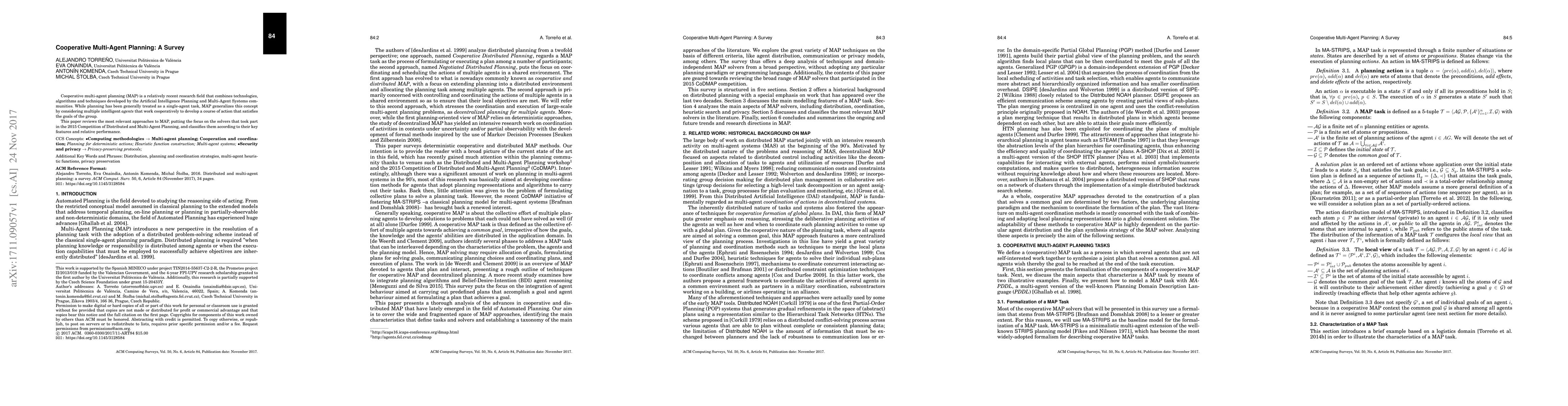 This paper surveys cooperative multi-agent planning (MAP) approaches, emphasizing solvers from the 2015 Competition of Distributed and Multi-Agent Planning, and categorizes them based on their features and performance. It highlights the integration of AI planning and multi-agent systems in developing group-oriented action plans.