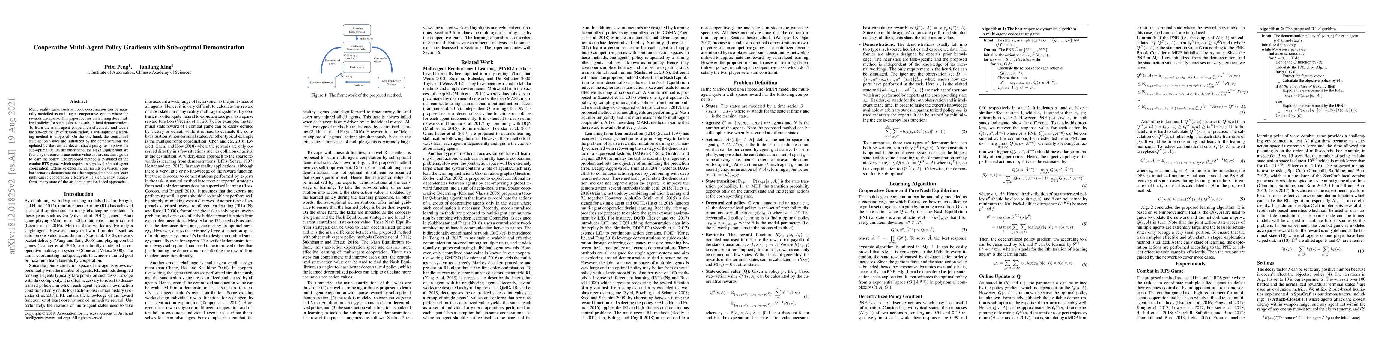 This paper proposes a self-improving learning method for decentralized policies in multi-agent cooperative systems using sub-optimal demonstrations. The method combines centralized state-action value updates and Nash Equilibrium guidance, achieving superior performance in combat RTS games compared to state-of-the-art approaches.