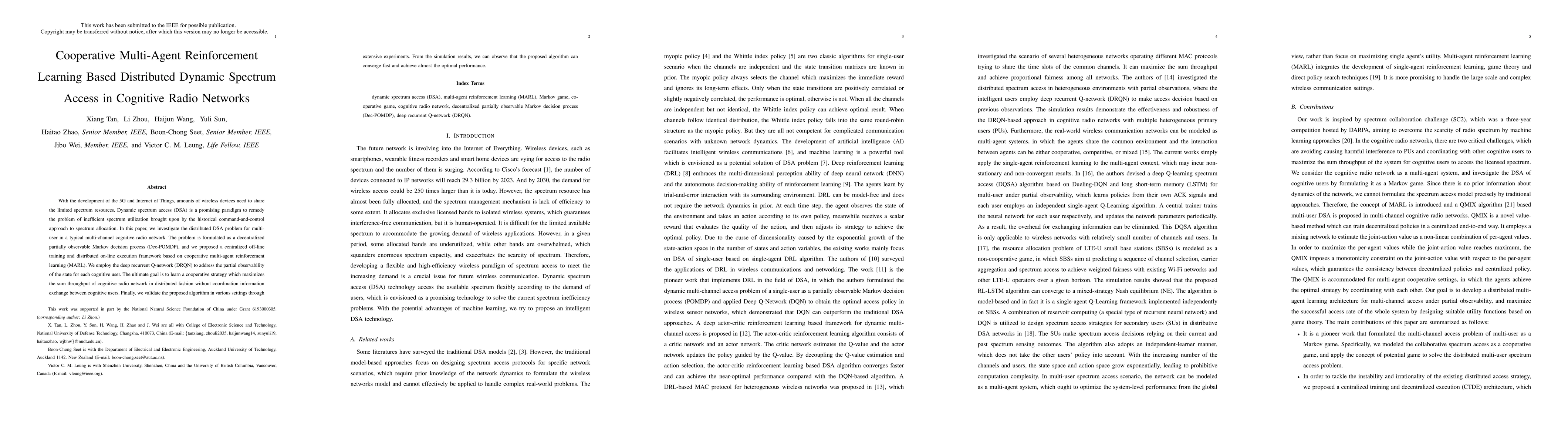 This paper proposes a cooperative multi-agent reinforcement learning framework for distributed dynamic spectrum access in cognitive radio networks, employing deep recurrent Q-networks to handle state partial observability and achieving near-optimal sum throughput. Extensive experiments demonstrate the algorithm's fast convergence and effectiveness.