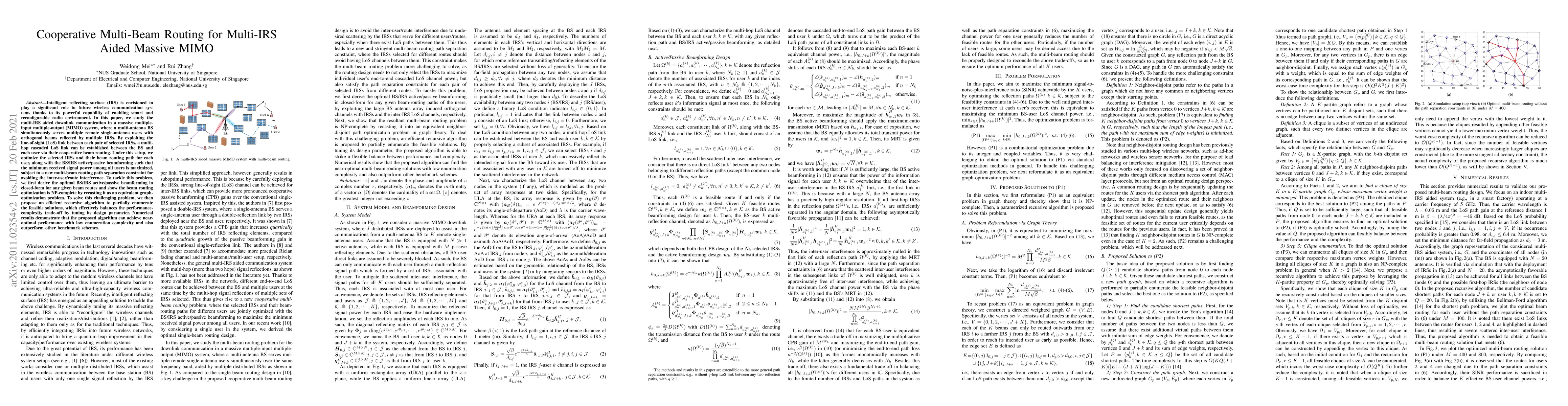 Intelligent reflecting surface (IRS) is envisioned to play a significant role in future wireless communication systems thanks to its powerful capability of enabling smart and reconfigurable radio environment. In this paper, we study the multi-IRS aided downlink communication in a massive multiple-input multiple-output (MIMO) system, where a multi-antenna BS simultaneously serves multiple remote single-antenna users with orthogonal beams reflected by multiple IRSs. By exploiting the line-of-sight (LoS) link between each pair of selected IRSs, a multi-hop cascaded LoS link can be established between the BS and each user via their cooperative beam routing. Under this setup, we optimize the selected IRSs and their beam routing path for each user, along with the BS/IRS active/passive beamforming such that the minimum received signal power among all users is maximized, subject to a new multi-beam routing path separation constraint for avoiding the inter-user/route interference. To tackle this problem, we first derive the optimal BS/IRS active/passive beamforming in closed-form for any given beam routes and show the beam routing optimization is NP-complete by recasting it as an equivalent graph-optimization problem. To solve this challenging problem, we then propose an efficient recursive algorithm to partially enumerate the feasible solutions, which effectively balances the performance-complexity trade-off by tuning its design parameter. Numerical results demonstrate that the proposed algorithm can achieve near-optimal performance with low enumeration complexity and also outperform other benchmark schemes.