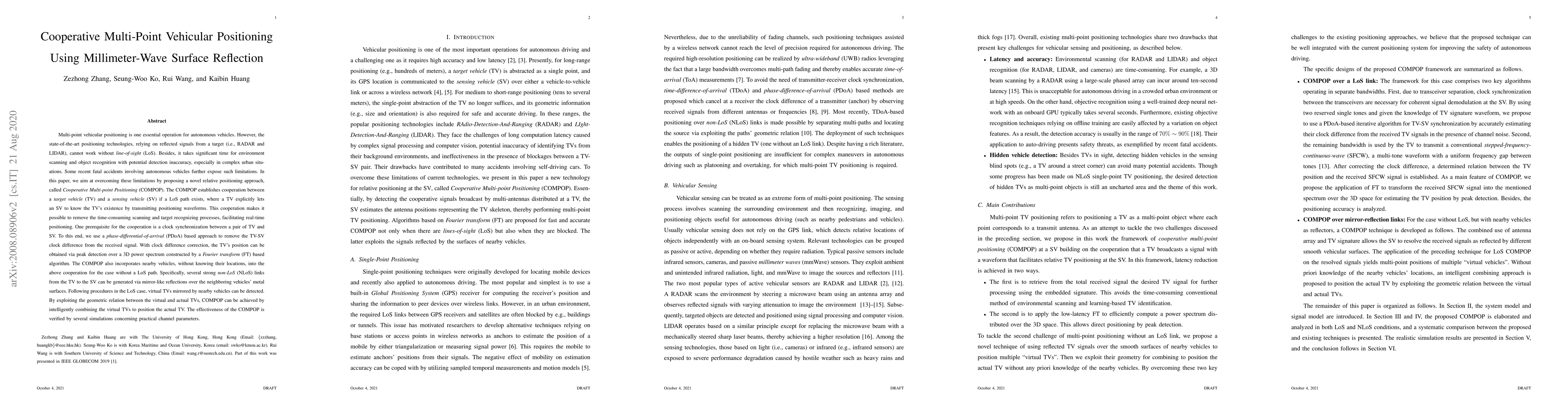 This paper proposes a Cooperative Multi-point Positioning (COMPOP) method for real-time vehicular positioning using millimeter-wave surface reflection, eliminating the need for line-of-sight and reducing scanning time. It achieves clock synchronization and position determination via a phase-differential-of-arrival approach and a Fourier transform-based algorithm.