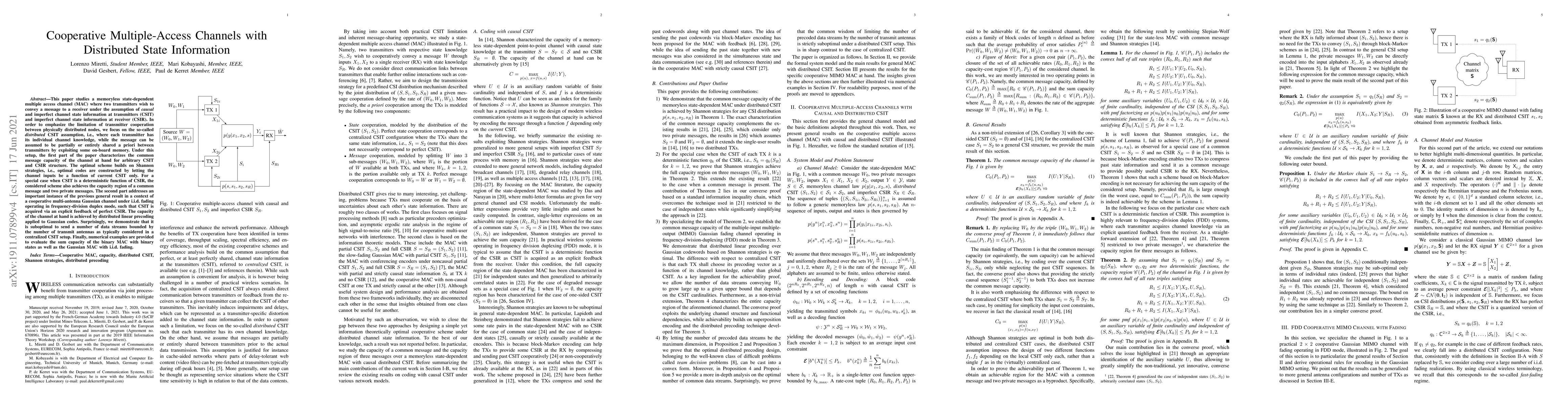 This paper studies a memoryless state-dependent multiple access channel (MAC) where two transmitters wish to convey a message to a receiver under the assumption of causal and imperfect channel state information at transmitters (CSIT) and imperfect channel state information at receiver (CSIR). In order to emphasize the limitation of transmitter cooperation between physically distributed nodes, we focus on the so-called distributed CSIT assumption, i.e. where each transmitter has its individual channel knowledge, while the message can be assumed to be partially or entirely shared a priori between transmitters by exploiting some on-board memory. Under this setup, the first part of the paper characterizes the common message capacity of the channel at hand for arbitrary CSIT and CSIR structure. The optimal scheme builds on Shannon strategies, i.e. optimal codes are constructed by letting the channel inputs be a function of current CSIT only. For a special case when CSIT is a deterministic function of CSIR, the considered scheme also achieves the capacity region of a common message and two private messages. The second part addresses an important instance of the previous general result in a context of a cooperative multi-antenna Gaussian channel under i.i.d. fading operating in frequency-division duplex mode, such that CSIT is acquired via an explicit feedback of perfect CSIR. The capacity of the channel at hand is achieved by distributed linear precoding applied to Gaussian codes. Surprisingly, we demonstrate that it is suboptimal to send a number of data streams bounded by the number of transmit antennas as typically considered in a centralized CSIT setup. Finally, numerical examples are provided to evaluate the sum capacity of the binary MAC with binary states as well as the Gaussian MAC with i.i.d. fading.