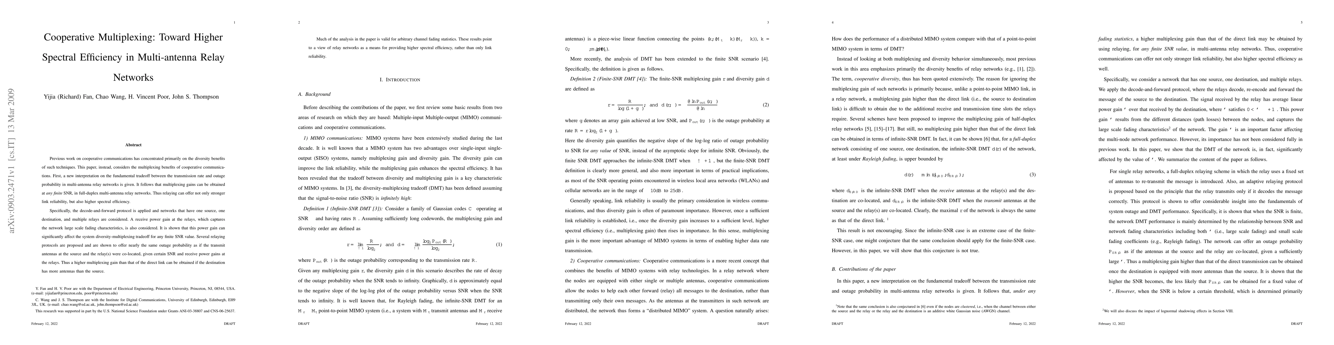 Previous work on cooperative communications has concentrated primarily on the diversity benefits of such techniques. This paper, instead, considers the multiplexing benefits of cooperative communications. First, a new interpretation on the fundamental tradeoff between the transmission rate and outage probability in multi-antenna relay networks is given. It follows that multiplexing gains can be obtained at any finite SNR, in full-duplex multi-antenna relay networks. Thus relaying can offer not only stronger link reliability, but also higher spectral efficiency. Specifically, the decode-and-forward protocol is applied and networks that have one source, one destination, and multiple relays are considered. A receive power gain at the relays, which captures the network large scale fading characteristics, is also considered. It is shown that this power gain can significantly affect the system diversity-multiplexing tradeoff for any finite SNR value. Several relaying protocols are proposed and are shown to offer nearly the same outage probability as if the transmit antennas at the source and the relay(s) were co-located, given certain SNR and receive power gains at the relays. Thus a higher multiplexing gain than that of the direct link can be obtained if the destination has more antennas than the source. Much of the analysis in the paper is valid for arbitrary channel fading statistics. These results point to a view of relay networks as a means for providing higher spectral efficiency, rather than only link reliability.