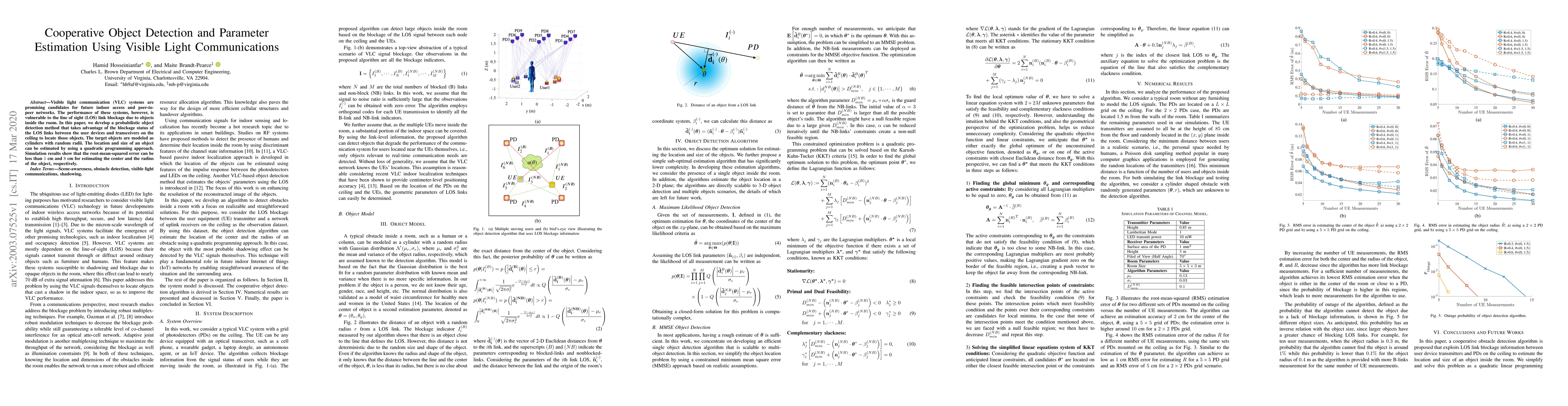 Visible light communication (VLC) systems are promising candidates for future indoor access and peer-to-peer networks. The performance of these systems, however, is vulnerable to the line of sight (LOS) link blockage due to objects inside the room. In this paper, we develop a probabilistic object detection method that takes advantage of the blockage status of the LOS links between the user devices and transceivers on the ceiling to locate those objects. The target objects are modeled as cylinders with random radii. The location and size of an object can be estimated by using a quadratic programming approach. Simulation results show that the root-mean-squared error can be less than $1$ cm and $8$ cm for estimating the center and the radius of the object, respectively.