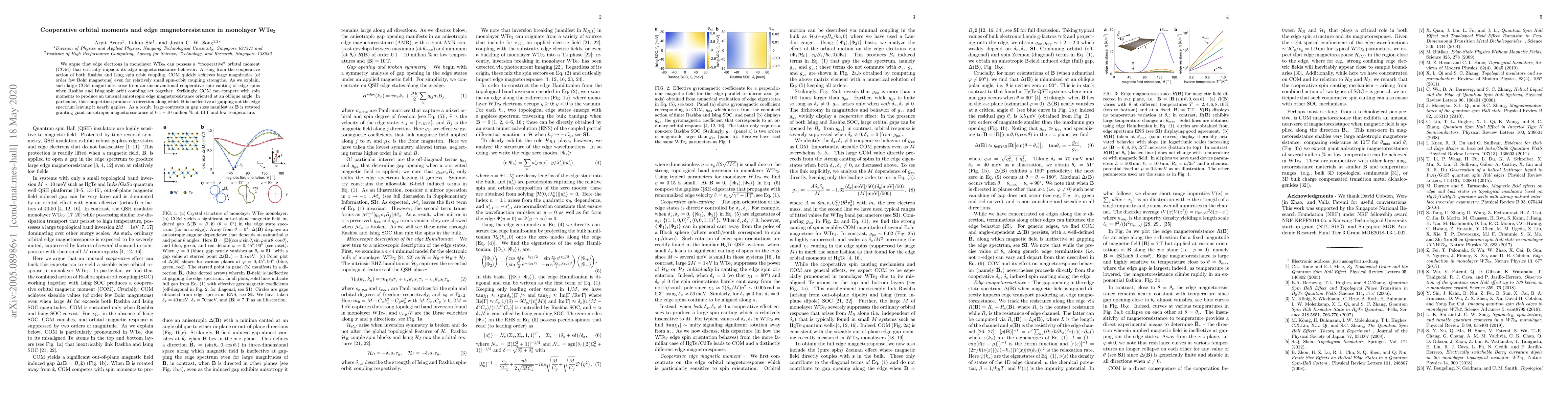 We argue that edge electrons in monolayer WTe$_2$ can possess a "cooperative" orbital moment (COM) that critically impacts its edge magnetoresistance behavior. Arising from the cooperative action of both Rashba and Ising spin orbit coupling, COM quickly achieves large magnitudes (of order few Bohr magnetons) even for relatively small spin-orbit coupling strengths. As we explain, such large COM magnitudes arise from an unconventional cooperative spin canting of edge spins when Rashba and Ising spin orbit coupling act together. Strikingly, COM can compete with spin moments to produce an unusual anisotropic edge magnetoresistance oriented at an oblique angle. In particular, this competition produces a direction along which $\mathbf{B}$ is ineffective at gapping out the edge spectrum leaving it nearly gapless. As a result, large contrasts in gap sizes manifest as $\mathbf{B}$ is rotated granting giant anisotropic magnetoresistance of 0.1-10 million % at 10 T and low temperature.