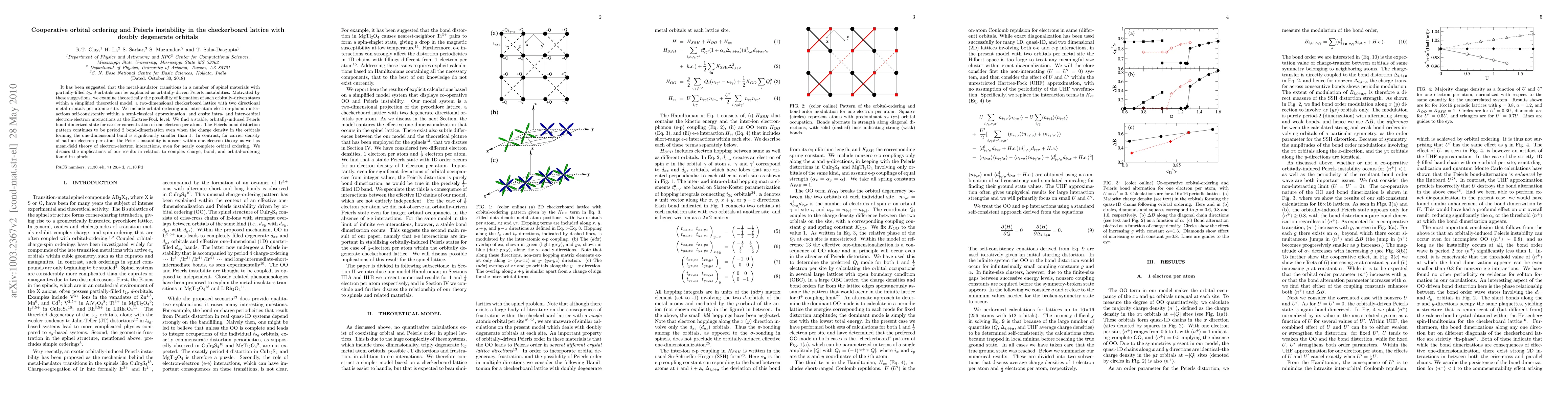 It has been suggested that the metal-insulator transitions in a number of spinel materials with partially-filled t_2g d-orbitals can be explained as orbitally-driven Peierls instabilities. Motivated by these suggestions, we examine theoretically the possibility of formation of such orbitally-driven states within a simplified theoretical model, a two-dimensional checkerboard lattice with two directional metal orbitals per atomic site. We include orbital ordering and inter-atom electron-phonon interactions self-consistently within a semi-classical approximation, and onsite intra- and inter-orbital electron-electron interactions at the Hartree-Fock level. We find a stable, orbitally-induced Peierls bond-dimerized state for carrier concentration of one electron per atom. The Peierls bond distortion pattern continues to be period 2 bond-dimerization even when the charge density in the orbitals forming the one-dimensional band is significantly smaller than 1. In contrast, for carrier density of half an electron per atom the Peierls instability is absent within one-electron theory as well as mean-field theory of electron-electron interactions, even for nearly complete orbital ordering. We discuss the implications of our results in relation to complex charge, bond, and orbital-ordering found in spinels.