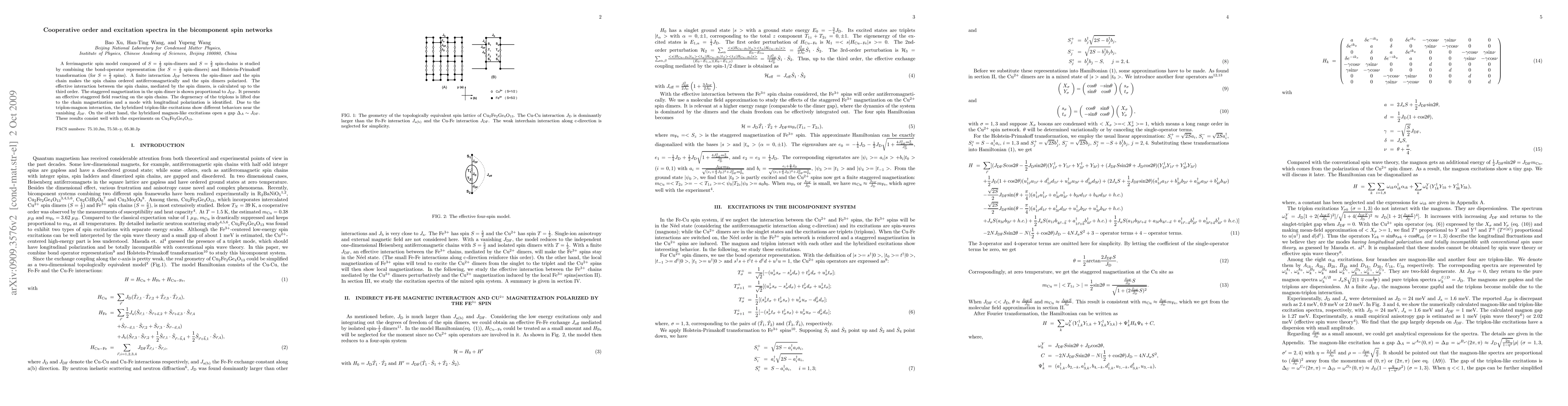 A ferrimagnetic spin model composed of $S=1/2$ spin-dimers and $S=5/2$ spin-chains is studied by combining the bond-operator representation (for $S=1/2$ spin-dimers) and Holstein-Primakoff transformation (for $S=5/2$ spins). A finite interaction $J_{\rm DF}$ between the spin-dimer and the spin chain makes the spin chains ordered antiferromagnetically and the spin dimers polarized. The effective interaction between the spin chains, mediated by the spin dimers, is calculated up to the third order. The staggered magnetization in the spin dimer is shown proportional to $J_{\rm DF}$. It presents an effective staggered field reacting on the spin chains. The degeneracy of the triplons is lifted due to the chain magnetization and a mode with longitudinal polarization is identified. Due to the triplon-magnon interaction, the hybridized triplon-like excitations show different behaviors near the vanishing $J_{\rm DF}$. On the other hand, the hybridized magnon-like excitations open a gap $\Delta_A\sim J_{\rm DF}$. These results consist well with the experiments on Cu$_{2}$Fe$_{2}$Ge$_{4}$O$_{13}$.