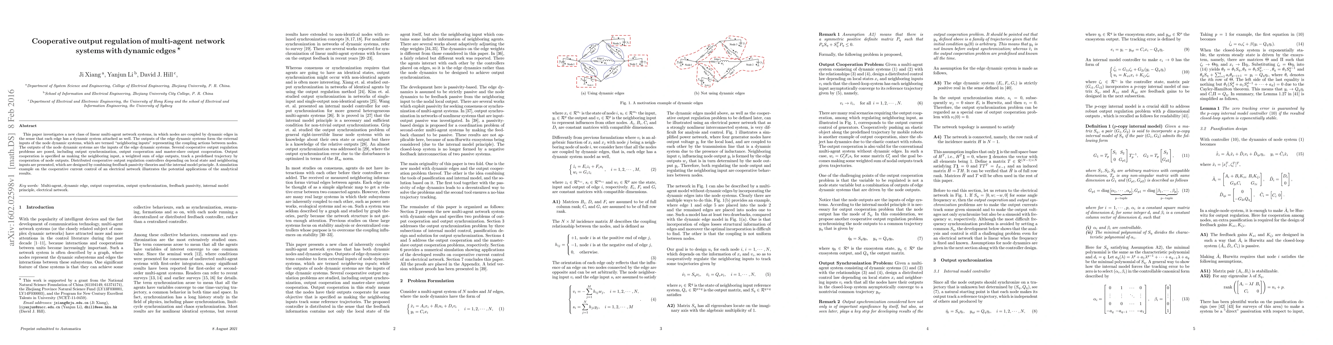 This paper investigates a new class of linear multi-agent network systems, in which nodes are coupled by dynamic edges in the sense that each edge has a dynamic system attached as well. The outputs of the edge dynamic systems form the external inputs of the node dynamic systems, which are termed "neighboring inputs" representing the coupling actions between nodes. The outputs of the node dynamic systems are the inputs of the edge dynamic systems. Several cooperative output regulation problems are posed, including output synchronization, output cooperation and master-slave output cooperation. Output cooperation is specified as making the neighboring input, a weighted sum of edge outputs, track a predefined trajectory by cooperation of node outputs. Distributed cooperative output regulation controllers depending on local state and neighboring inputs are presented, which are designed by combining feedback passivity theories and the internal model principle. A simulation example on the cooperative current control of an electrical network illustrates the potential applications of the analytical results.