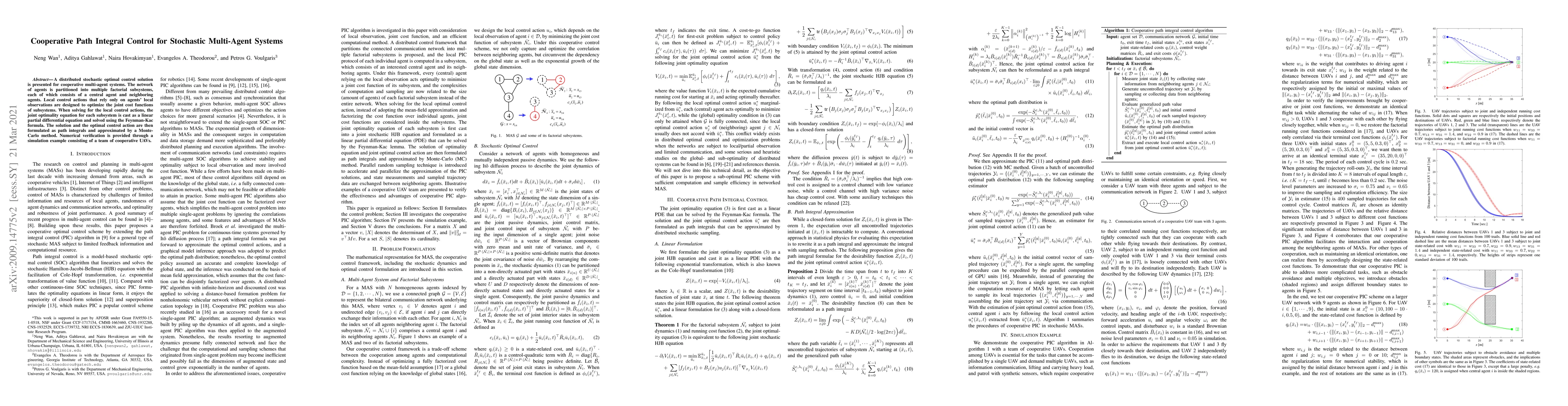 This paper proposes a distributed stochastic optimal control method for cooperative multi-agent systems, where local control actions are designed to optimize joint cost functions using a linear partial differential equation solved via the Feynman-Kac formula. The approach is verified through a simulation of cooperative UAVs.