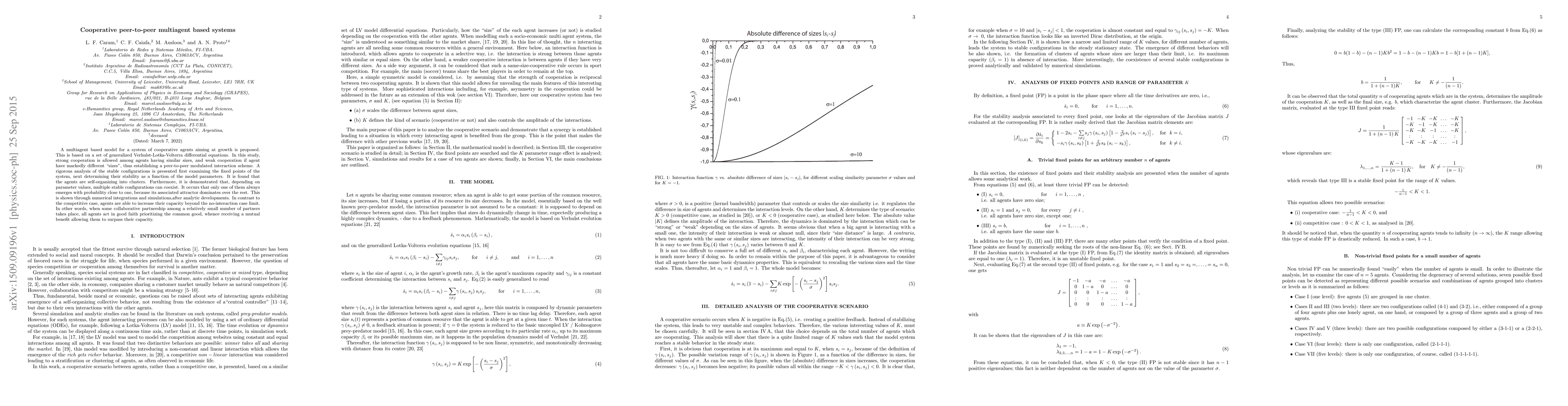 A multiagent based model for a system of cooperative agents aiming at growth is proposed. This is based on a set of generalized Verhulst-Lotka-Volterra differential equations. In this study, strong cooperation is allowed among agents having similar sizes, and weak cooperation if agent have markedly different "sizes", thus establishing a peer-to-peer modulated interaction scheme. A rigorous analysis of the stable configurations is presented first examining the fixed points of the system, next determining their stability as a function of the model parameters. It is found that the agents are self-organizing into clusters. Furthermore, it is demonstrated that, depending on parameter values, multiple stable configurations can coexist. It occurs that only one of them always emerges with probability close to one, because its associated attractor dominates over the rest. This is shown through numerical integrations and simulations,after analytic developments. In contrast to the competitive case, agents are able to increase their capacity beyond the no-interaction case limit. In other words, when some collaborative partnership among a relatively small number of partners takes place, all agents act in good faith prioritizing the common good, whence receiving a mutual benefit allowing them to surpass their capacity.