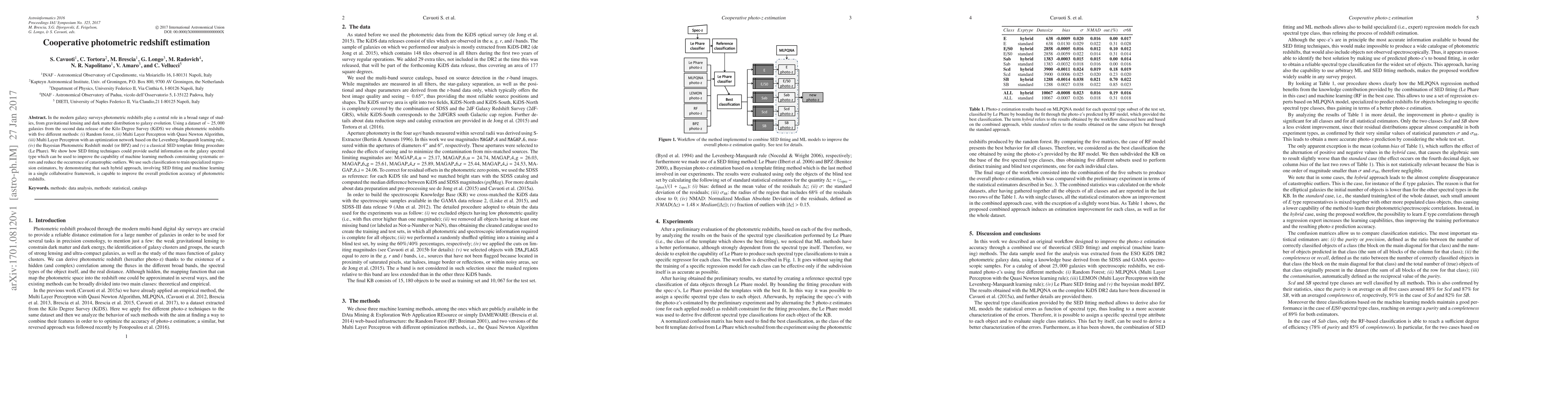 This paper explores cooperative photometric redshift estimation using a dataset from the Kilo Degree Survey, employing five different methods to improve accuracy. By combining SED fitting and machine learning techniques, the authors demonstrate enhanced prediction precision and reduced systematic errors.