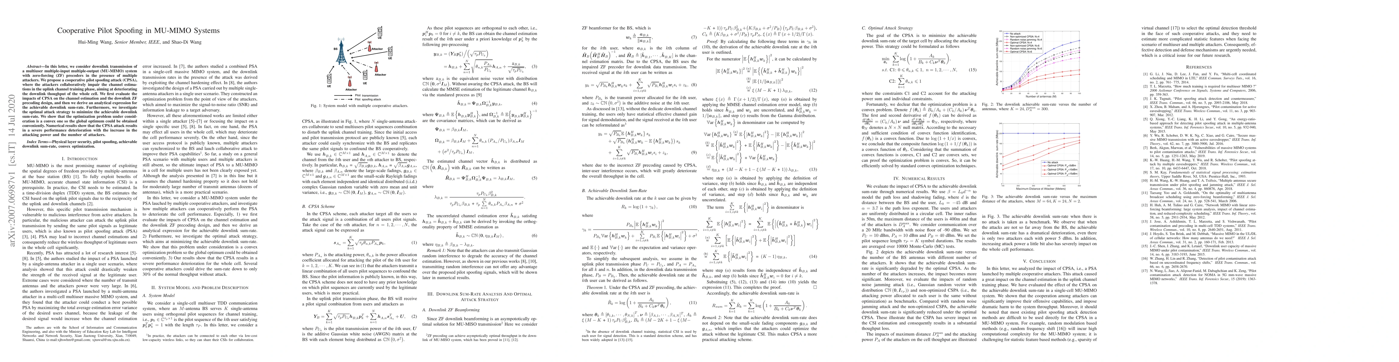 This paper proposes a cooperative pilot spoofing attack (CPSA) in MU-MIMO systems, where attackers collaboratively impair channel estimations to degrade downlink throughput. It evaluates the impact on channel estimation and derives an analytical expression for the achievable downlink sum-rate, showing severe performance deterioration with increased attack power and number of attackers.