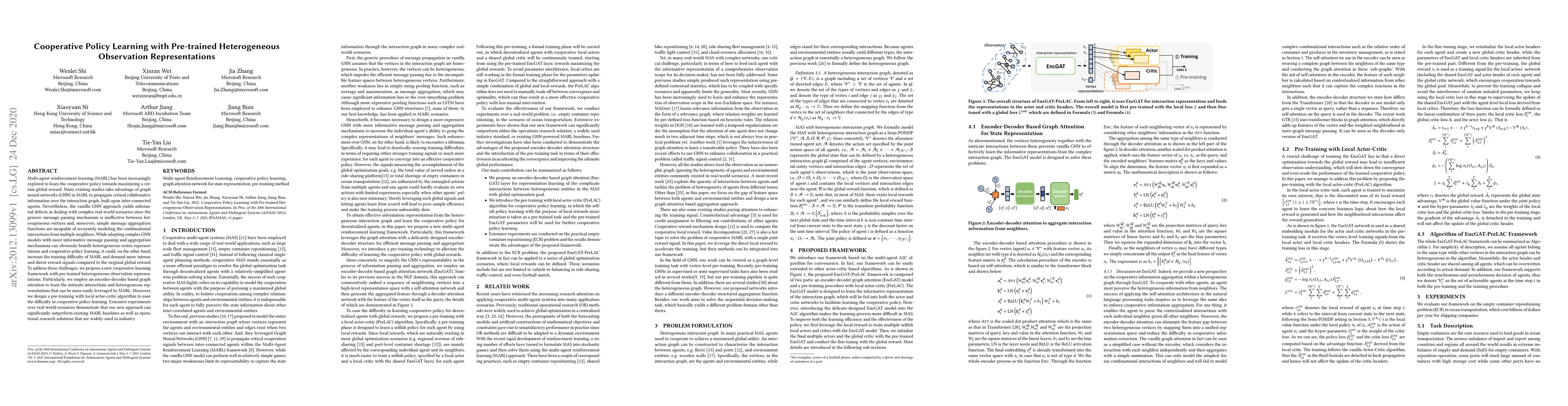 This paper proposes a cooperative learning framework for multi-agent reinforcement learning using pre-trained heterogeneous observation representations. It employs graph attention networks to model complex interactions and uses a pre-training method to simplify cooperative policy learning, achieving superior performance over existing MARL baselines in real-world scenarios.