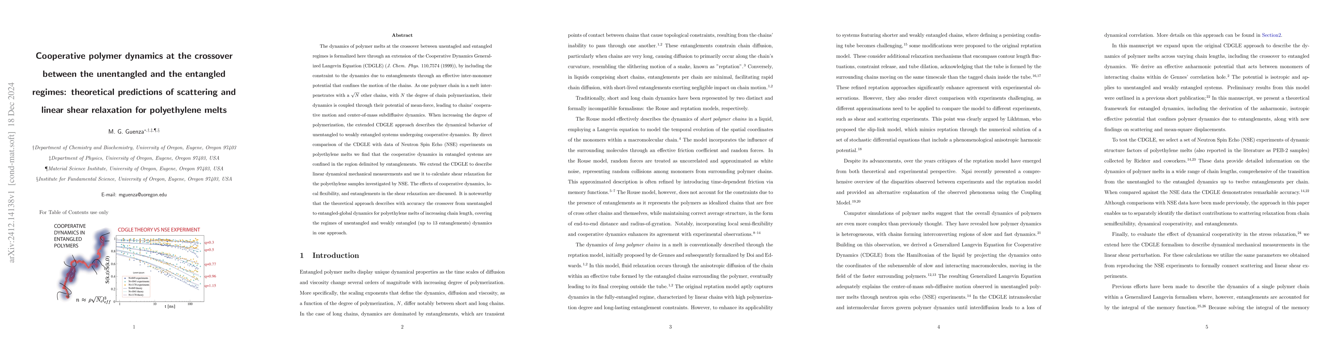 This paper extends the Cooperative Dynamics Generalized Langevin Equation (CDGLE) to study polymer dynamics at the crossover between unentangled and entangled regimes, using polyethylene melts as a model. The extended CDGLE accurately captures cooperative dynamics and center-of-mass subdiffusive behavior, predicting the crossover behavior from unentangled to entangled polymer dynamics and describing shear relaxation.