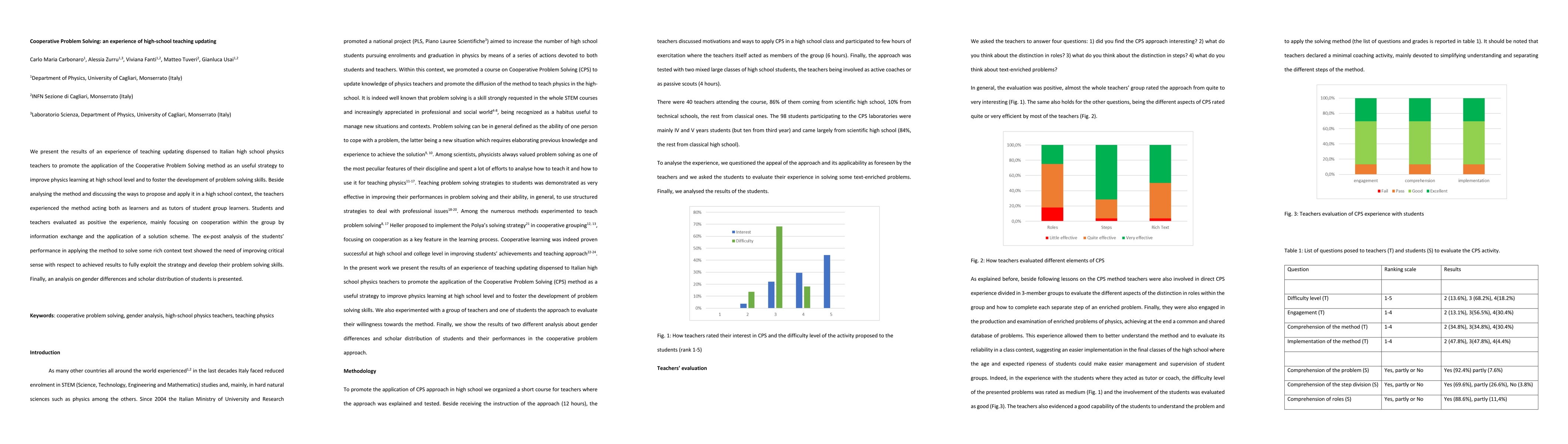 We present the results of an experience of teaching updating dispensed to Italian high-school physics teachers to promote the application of the Cooperative Problem Solving method as an useful strategy to improve physics learning at high-school level and to foster the development of problem solving skills. Beside analysing the method and discussing the ways to propose and apply it in a high-school context, the teachers experienced the method acting both as learners and as tutors of student group learners. Students and teachers evaluated as positive the experience, mainly focusing on cooperation within the group by information exchange and the application of a solution scheme. The ex-post analysis of the students' performance in applying the method to solve some rich context text showed the need of improving critical sense with respect to achieved results to fully exploit the strategy and develop their problem solving skills. Finally, an analysis on gender differences and scholar distribution of students is presented.