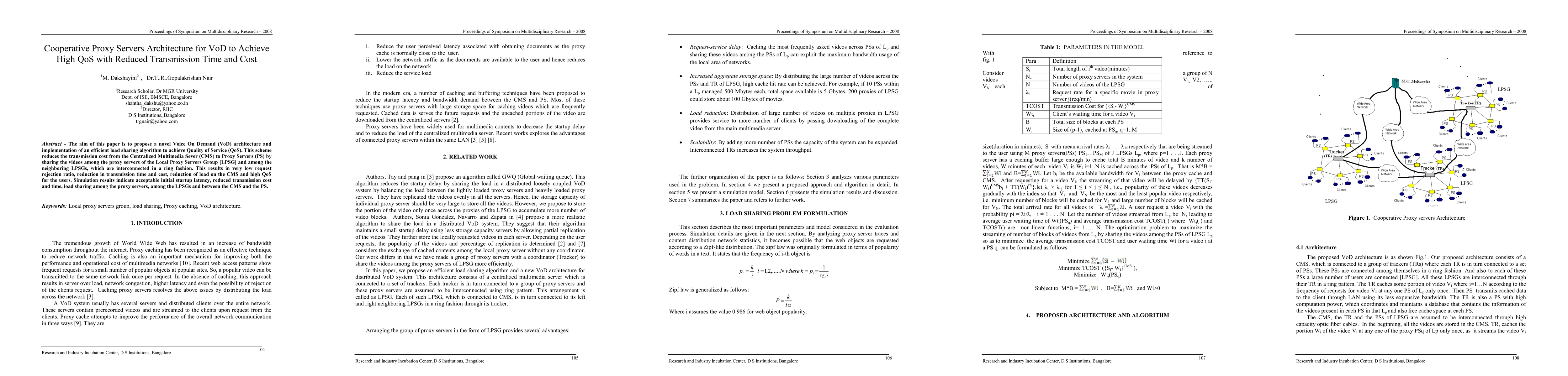- The aim of this paper is to propose a novel Voice On Demand (VoD) architecture and implementation of an efficient load sharing algorithm to achieve Quality of Service (QoS). This scheme reduces the transmission cost from the Centralized Multimedia Sever (CMS) to Proxy Servers (PS) by sharing the videos among the proxy servers of the Local Proxy Servers Group [LPSG] and among the neighboring LPSGs, which are interconnected in a ring fashion. This results in very low request rejection ratio, reduction in transmission time and cost, reduction of load on the CMS and high QoS for the users. Simulation results indicate acceptable initial startup latency, reduced transmission cost and time, load sharing among the proxy servers, among the LPSGs and between the CMS and the PS.