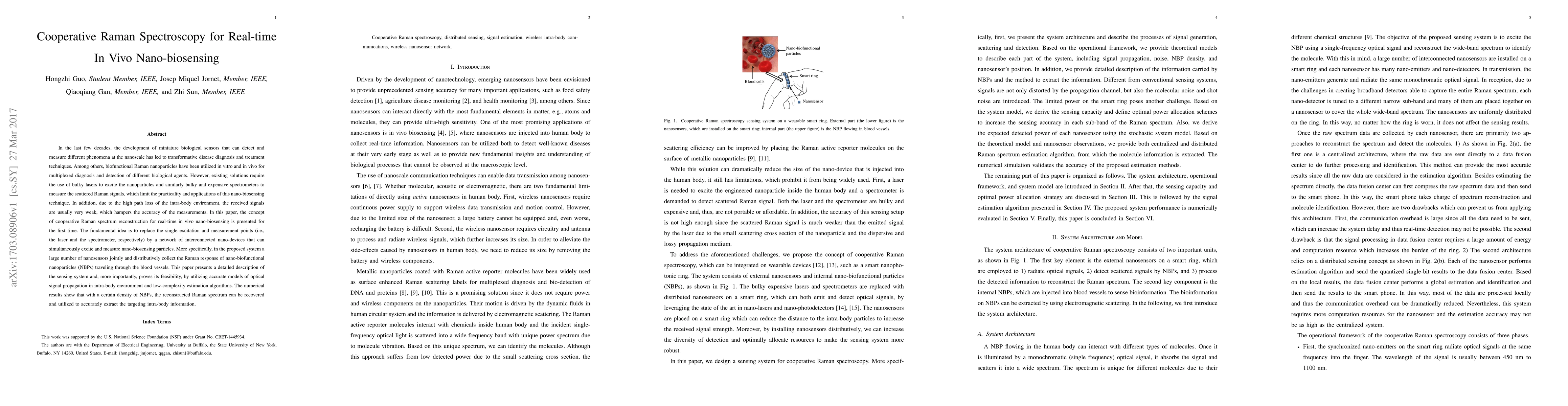 This paper introduces cooperative Raman spectroscopy for real-time in vivo nano-biosensing, proposing a network of interconnected nanosensors to replace bulky lasers and spectrometers. The system aims to enhance the accuracy and practicality of nano-biosensing by jointly collecting Raman responses from nano-biofunctional particles, demonstrating feasibility through optical signal models and estimation algorithms.
