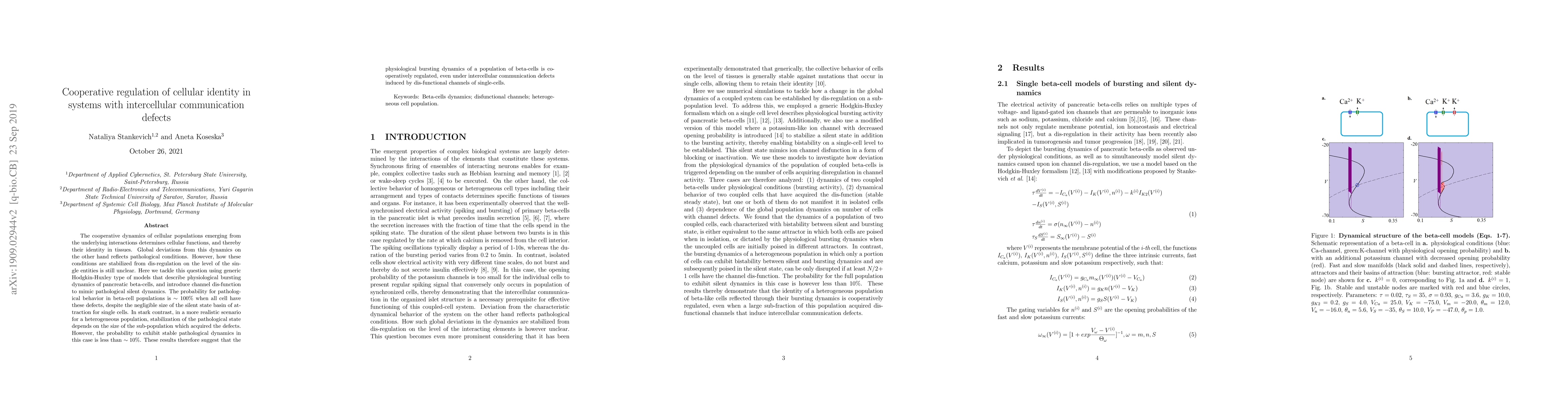 This paper explores how cellular identity in pancreatic beta-cell populations is cooperatively regulated despite intercellular communication defects. It finds that while all defective cells lead to $\sim100\%$ pathological behavior, heterogeneous populations with some defective cells show a much lower $\sim10\%$ probability of stable pathological dynamics, indicating cooperative regulation of physiological bursting dynamics.