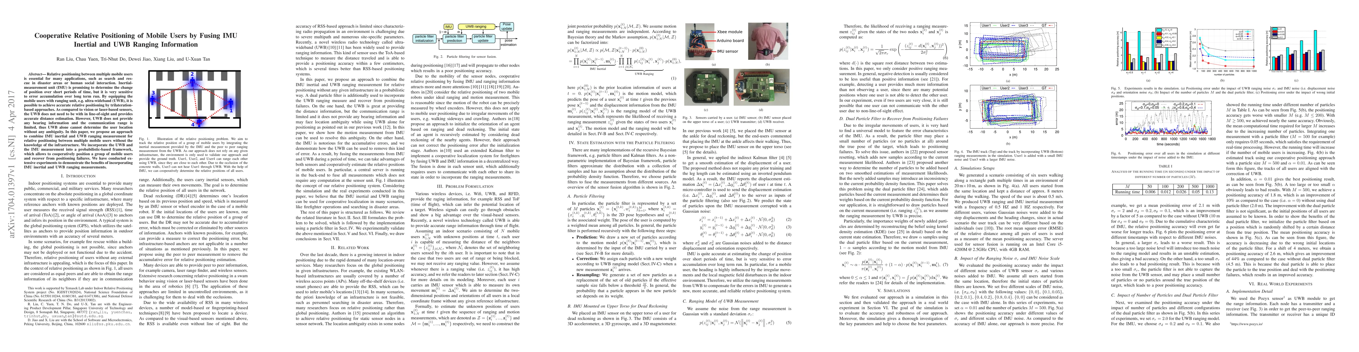 Relative positioning between multiple mobile users is essential for many applications, such as search and rescue in disaster areas or human social interaction. Inertial-measurement unit (IMU) is promising to determine the change of position over short periods of time, but it is very sensitive to error accumulation over long term run. By equipping the mobile users with ranging unit, e.g. ultra-wideband (UWB), it is possible to achieve accurate relative positioning by trilateration-based approaches. As compared to vision or laser-based sensors, the UWB does not need to be with in line-of-sight and provides accurate distance estimation. However, UWB does not provide any bearing information and the communication range is limited, thus UWB alone cannot determine the user location without any ambiguity. In this paper, we propose an approach to combine IMU inertial and UWB ranging measurement for relative positioning between multiple mobile users without the knowledge of the infrastructure. We incorporate the UWB and the IMU measurement into a probabilistic-based framework, which allows to cooperatively position a group of mobile users and recover from positioning failures. We have conducted extensive experiments to demonstrate the benefits of incorporating IMU inertial and UWB ranging measurements.