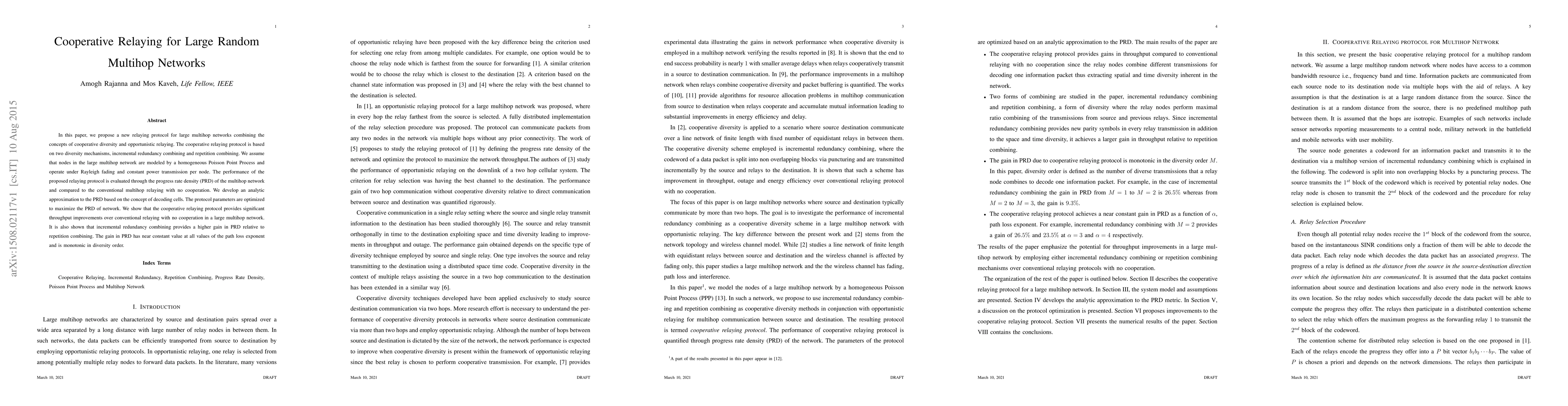 This paper proposes a cooperative relaying protocol for large multihop networks that combines cooperative diversity and opportunistic relaying, utilizing incremental redundancy combining and repetition combining. The protocol significantly improves throughput compared to conventional relaying, with incremental redundancy providing greater gains, and is optimized to maximize the network's progress rate density.