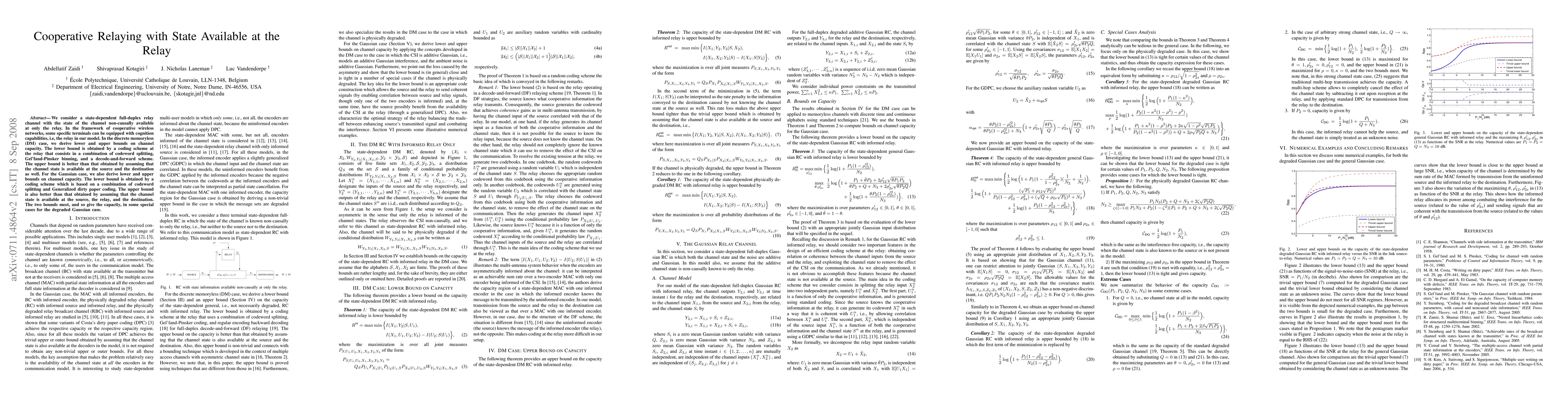 We consider a state-dependent full-duplex relay channel with the state of the channel non-causally available at only the relay. In the framework of cooperative wireless networks, some specific terminals can be equipped with cognition capabilities, i.e, the relay in our model. In the discrete memoryless (DM) case, we derive lower and upper bounds on channel capacity. The lower bound is obtained by a coding scheme at the relay that consists in a combination of codeword splitting, Gel'fand-Pinsker binning, and a decode-and-forward scheme. The upper bound is better than that obtained by assuming that the channel state is available at the source and the destination as well. For the Gaussian case, we also derive lower and upper bounds on channel capacity. The lower bound is obtained by a coding scheme which is based on a combination of codeword splitting and Generalized dirty paper coding. The upper bound is also better than that obtained by assuming that the channel state is available at the source, the relay, and the destination. The two bounds meet, and so give the capacity, in some special cases for the degraded Gaussian case.
