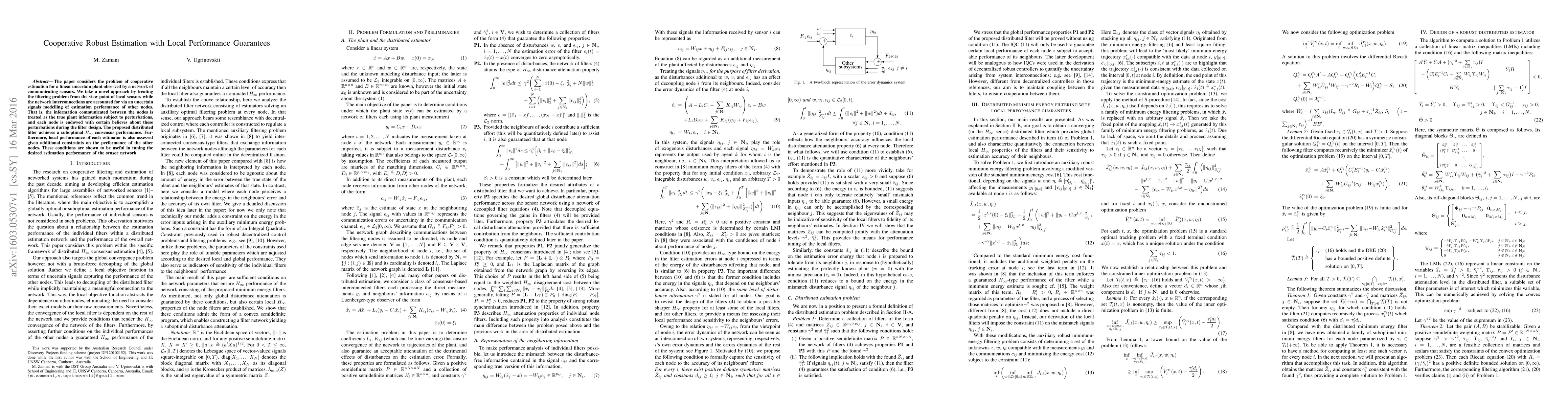The paper considers the problem of cooperative estimation for a linear uncertain plant observed by a network of communicating sensors. We take a novel approach by treating the filtering problem from the view point of local sensors while the network interconnections are accounted for via an uncertain signals modelling of estimation performance of other nodes. That is, the information communicated between the nodes is treated as the true plant information subject to perturbations, and each node is endowed with certain believes about these perturbations during the filter design. The proposed distributed filter achieves a suboptimal $H_\infty$ consensus performance. Furthermore, local performance of each estimator is also assessed given additional constraints on the performance of the other nodes. These conditions are shown to be useful in tuning the desired estimation performance of the sensor network.