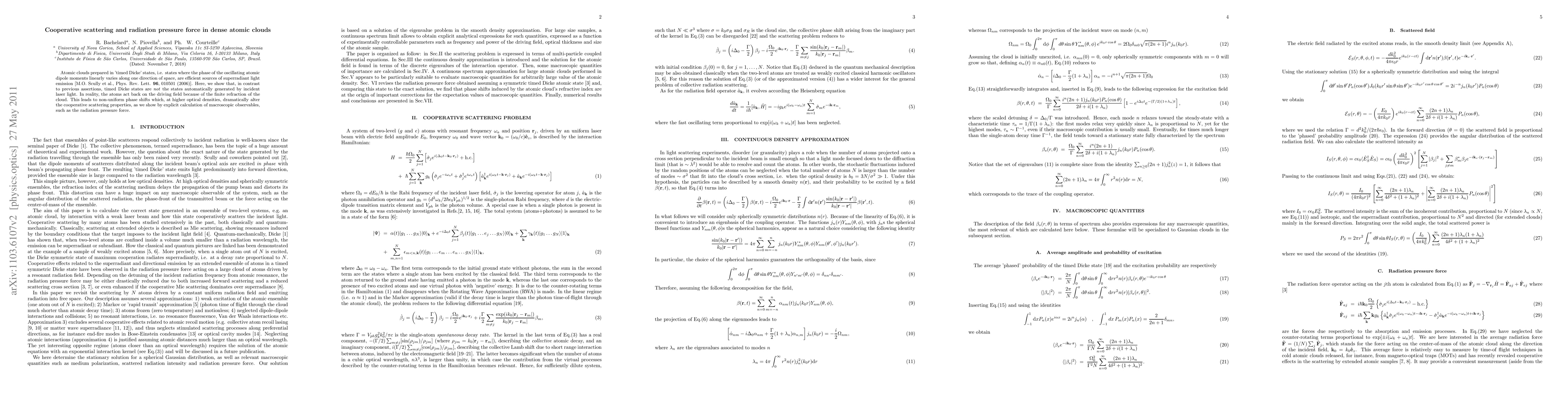 This paper investigates the collective scattering and radiation pressure in dense atomic clouds driven by a uniform radiation field, deriving analytical expressions for macroscopic quantities and comparing them to exact $N$-body solutions and symmetric timed Dicke state assumptions. It highlights the importance of considering the back action of atoms on the driving field, which leads to phase shifts due to finite refraction.