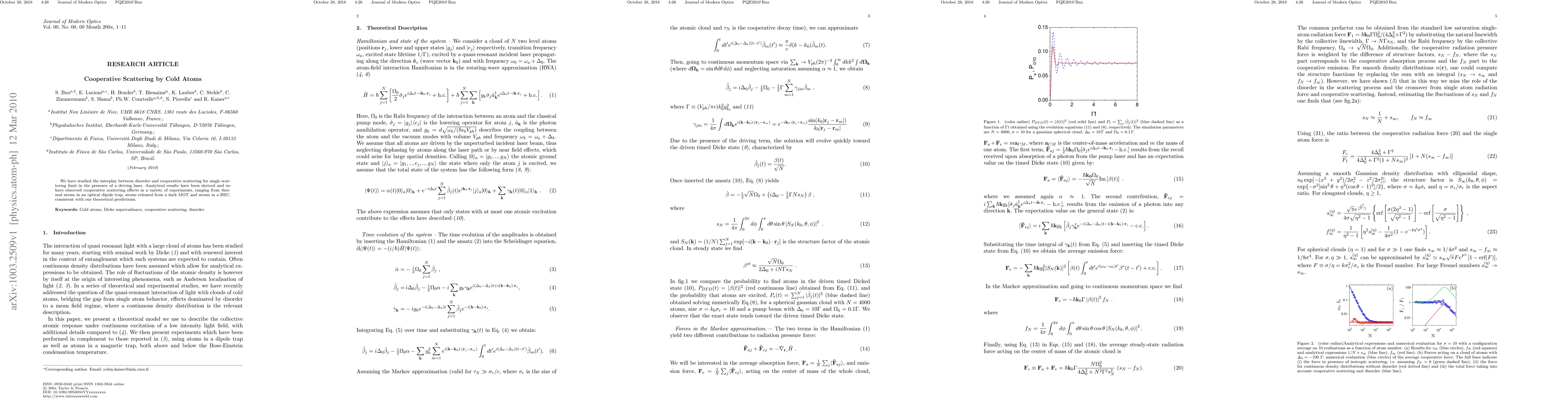 The research explores cooperative scattering by cold atoms in the presence of a driving laser, deriving analytical results and confirming them through experiments involving thermal atoms, atoms from a dark MOT, and BEC. Findings align with theoretical predictions, highlighting the interplay between disorder and cooperative scattering.