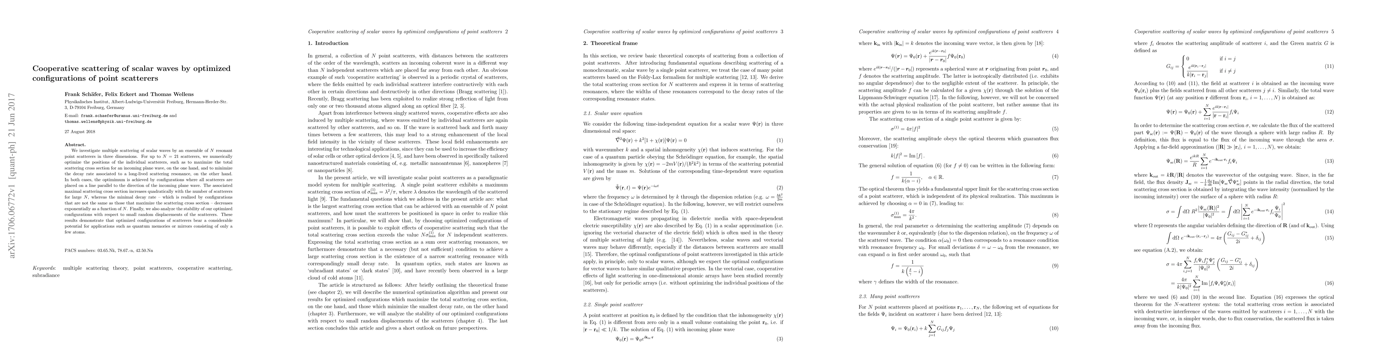 This paper explores the cooperative scattering of scalar waves by optimized arrangements of resonant point scatterers, finding that configurations maximizing scattering cross-section and minimizing decay rate for resonances both favor linear alignments parallel to the incoming wave. The study highlights the potential of such optimized scatterer setups for applications in quantum technologies.