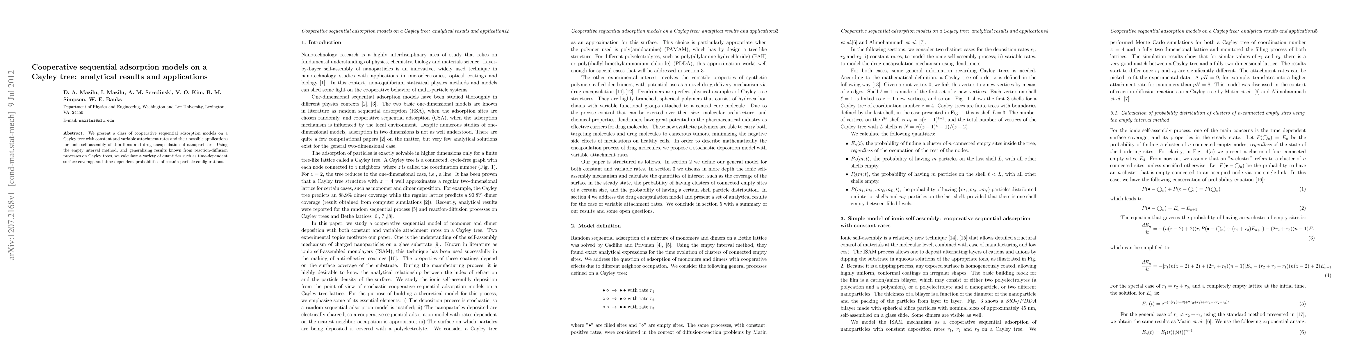 We present a class of cooperative sequential adsorption models on a Cayley tree with constant and variable attachment rates and their possible applications for ionic self-assembly of thin films and drug encapsulation of nanoparticles. Using the empty interval method, and generalizing results known from reaction-diffusion processes on Cayley trees, we calculate a variety of quantities such as time-dependent surface coverage and time-dependent probabilities of certain particle configurations.