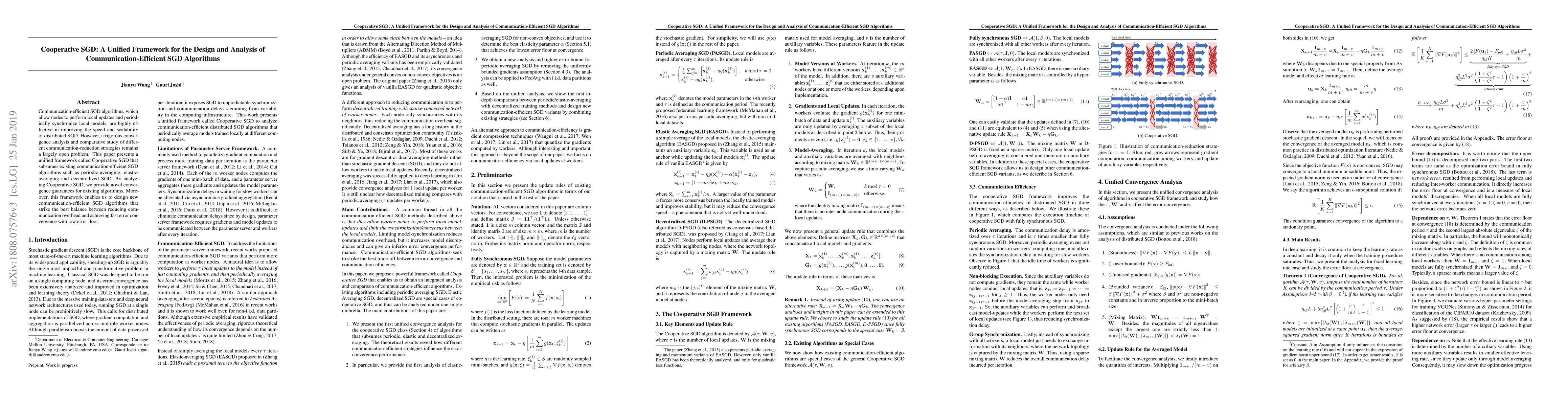 This paper introduces Cooperative SGD, a unified framework that encompasses various communication-efficient stochastic gradient descent (SGD) algorithms. It offers novel convergence guarantees and enables the design of new algorithms balancing reduced communication and fast convergence.
