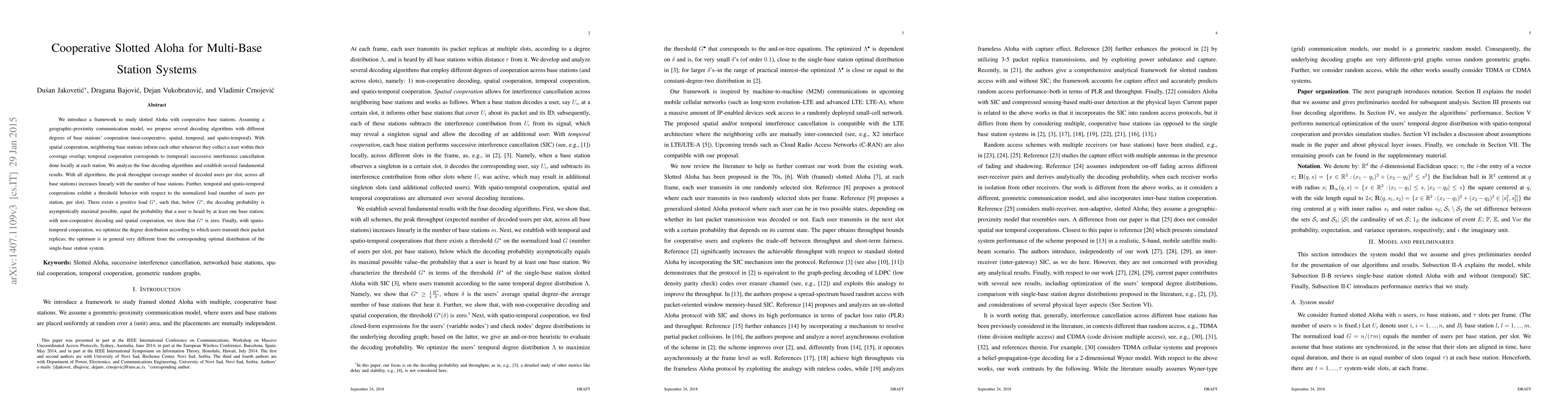This paper proposes a framework for slotted Aloha communication in multi-base station systems with cooperative strategies, analyzing four decoding algorithms with varying levels of base station cooperation. It finds that peak throughput increases linearly with the number of base stations, and temporal and spatio-temporal cooperations exhibit a threshold behavior in load-dependent decoding probability.