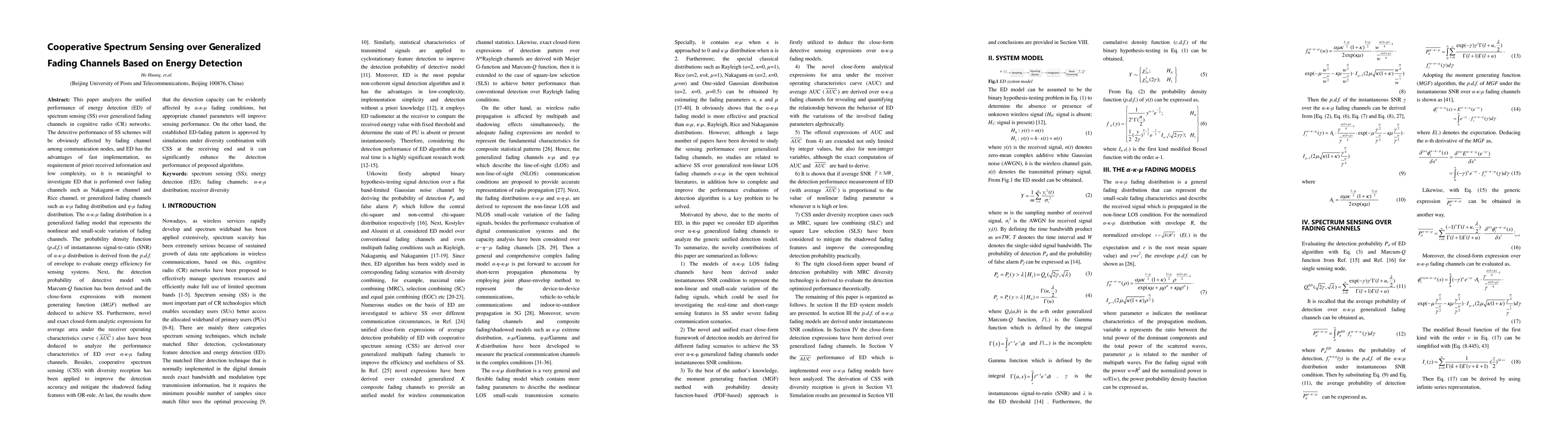 This paper investigates the performance of energy detection in cognitive radio networks under generalized fading channels, deriving closed-form expressions for detection probability and average area under the ROC curve. Cooperative spectrum sensing with diversity reception is applied to enhance detection accuracy, showing improved performance under favorable channel conditions.