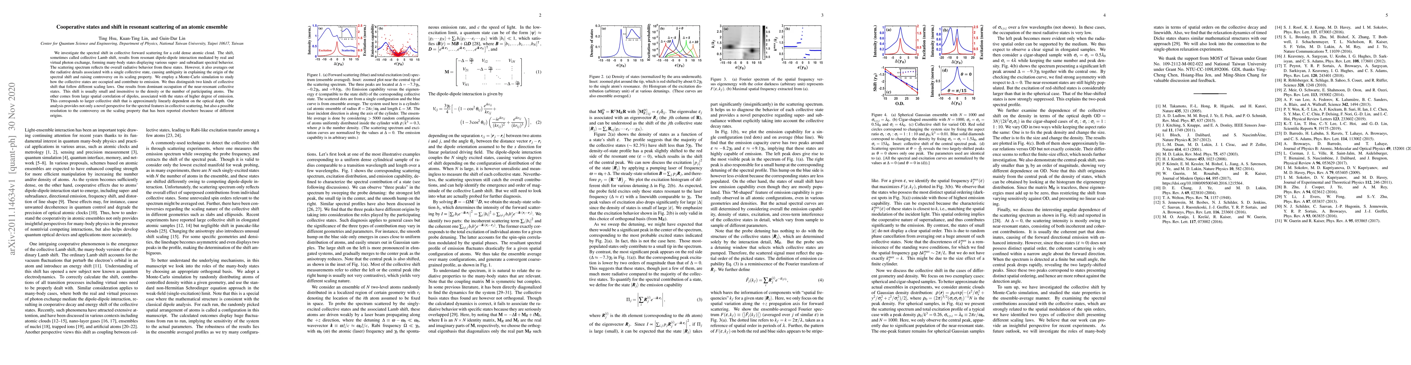 Abstract We investigate the spectral shift in collective forward scattering for a cold dense atomic cloud. The shift, sometimes called collective Lamb shift, results from resonant dipole-dipole interaction mediated by real and virtual photon exchange, forming many-body states displaying various super- and subradiant spectral behavior. The scattering spectrum reflects the overall radiative behavior from these states. However, it also averages out the radiative details associated with a single collective state, causing ambiguity in explaining the origin of the spectral shift and raising controversy on its scaling property. We employ a Monte-Carlo simulation to study how the collective states are occupied and contribute to emission. We thus distinguish two kinds of collective shift that follow different scaling laws. One results from dominant occupation of the near-resonant collective states. This shift is usually small and insensitive to the density or the number of participating atoms. The other comes from large spatial correlation of dipoles, associated with the states of higher degree of emission. This corresponds to larger collective shift that is approximately linearly dependent on the optical depth. Our analysis provides not only a novel perspective for the spectral features in collective scattering, but also a possible resolution to the controversy on the scaling property that has been reported elsewhere because of different origins.