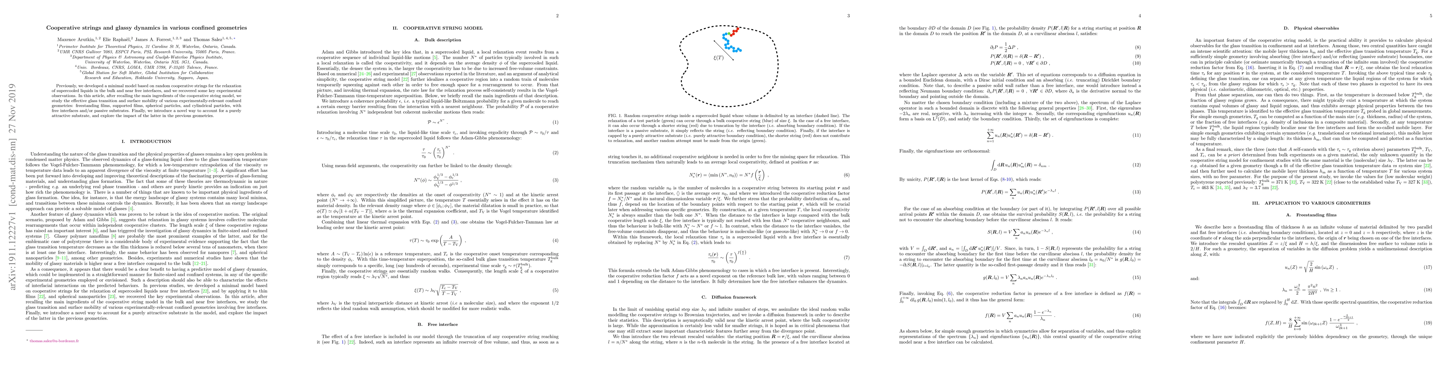 Previously, we developed a minimal model based on random cooperative strings for the relaxation of supercooled liquids in the bulk and near free interfaces, and we recovered some key experimental observations. In this article, after recalling the main ingredients of the cooperative string model, we study the effective glass transition and surface mobility of various experimentally-relevant confined geometries: freestanding films, supported films, spherical particles, and cylindrical particles, with free interfaces and/or passive substrates. Finally, we introduce a novel way to account for a purely attractive substrate, and explore the impact of the latter in the previous geometries.