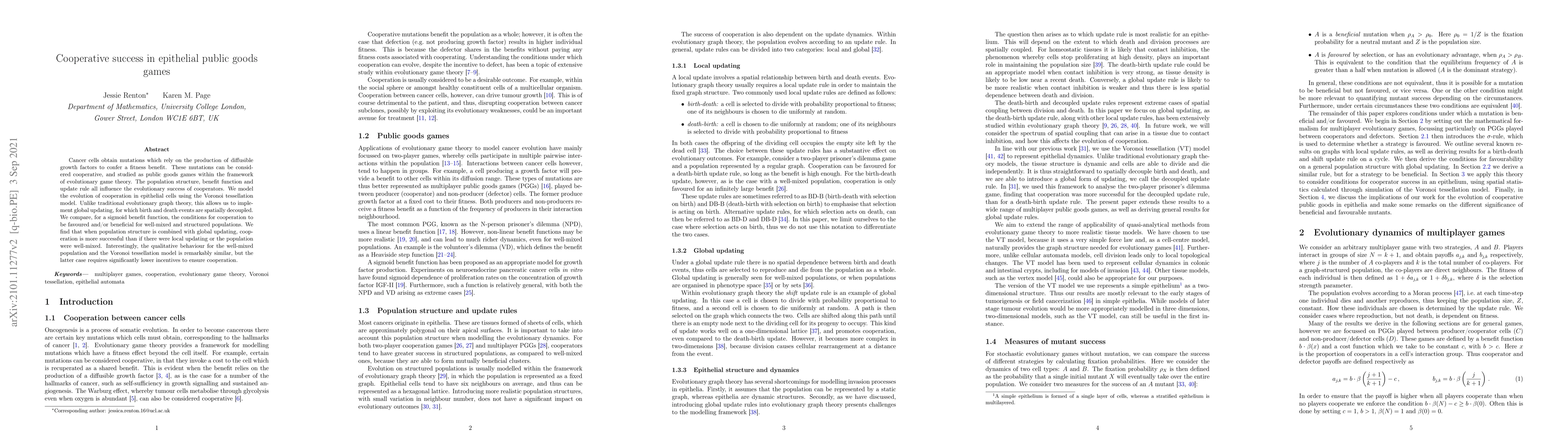 Cancer cells obtain mutations which rely on the production of diffusible growth factors to confer a fitness benefit. These mutations can be considered cooperative, and studied as public goods games within the framework of evolutionary game theory. The population structure, benefit function and update rule all influence the evolutionary success of cooperators. We model the evolution of cooperation in epithelial cells using the Voronoi tessellation model. Unlike traditional evolutionary graph theory, this allows us to implement global updating, for which birth and death events are spatially decoupled. We compare, for a sigmoid benefit function, the conditions for cooperation to be favoured and/or beneficial for well mixed and structured populations. We find that when population structure is combined with global updating, cooperation is more successful than if there were local updating or the population were well-mixed. Interestingly, the qualitative behaviour for the well-mixed population and the Voronoi tessellation model is remarkably similar, but the latter case requires significantly lower incentives to ensure cooperation.