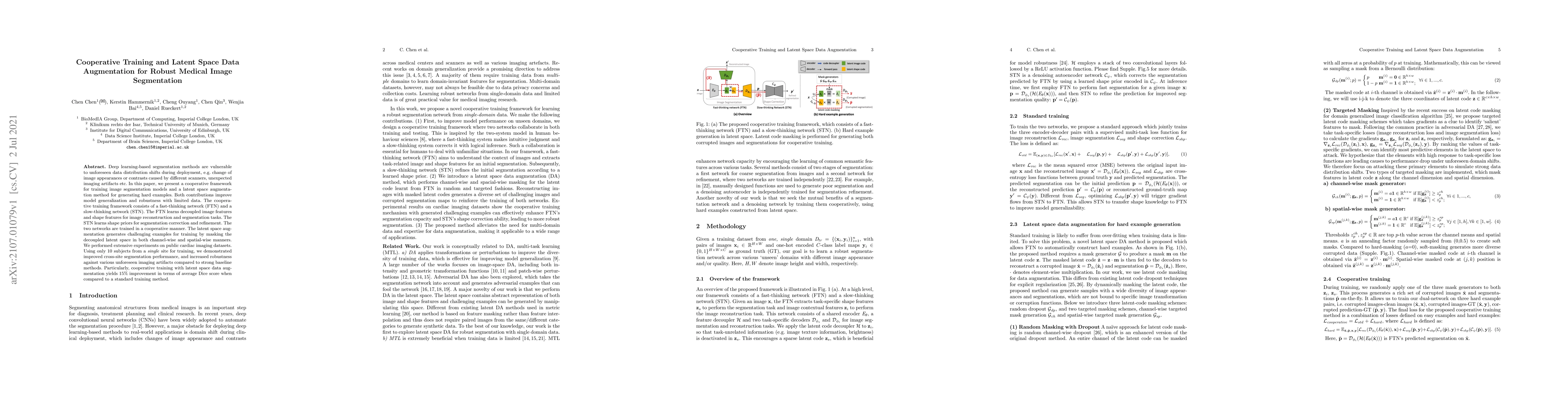 Deep learning-based segmentation methods are vulnerable to unforeseen data distribution shifts during deployment, e.g. change of image appearances or contrasts caused by different scanners, unexpected imaging artifacts etc. In this paper, we present a cooperative framework for training image segmentation models and a latent space augmentation method for generating hard examples. Both contributions improve model generalization and robustness with limited data. The cooperative training framework consists of a fast-thinking network (FTN) and a slow-thinking network (STN). The FTN learns decoupled image features and shape features for image reconstruction and segmentation tasks. The STN learns shape priors for segmentation correction and refinement. The two networks are trained in a cooperative manner. The latent space augmentation generates challenging examples for training by masking the decoupled latent space in both channel-wise and spatial-wise manners. We performed extensive experiments on public cardiac imaging datasets. Using only 10 subjects from a single site for training, we demonstrated improved cross-site segmentation performance and increased robustness against various unforeseen imaging artifacts compared to strong baseline methods. Particularly, cooperative training with latent space data augmentation yields 15% improvement in terms of average Dice score when compared to a standard training method.