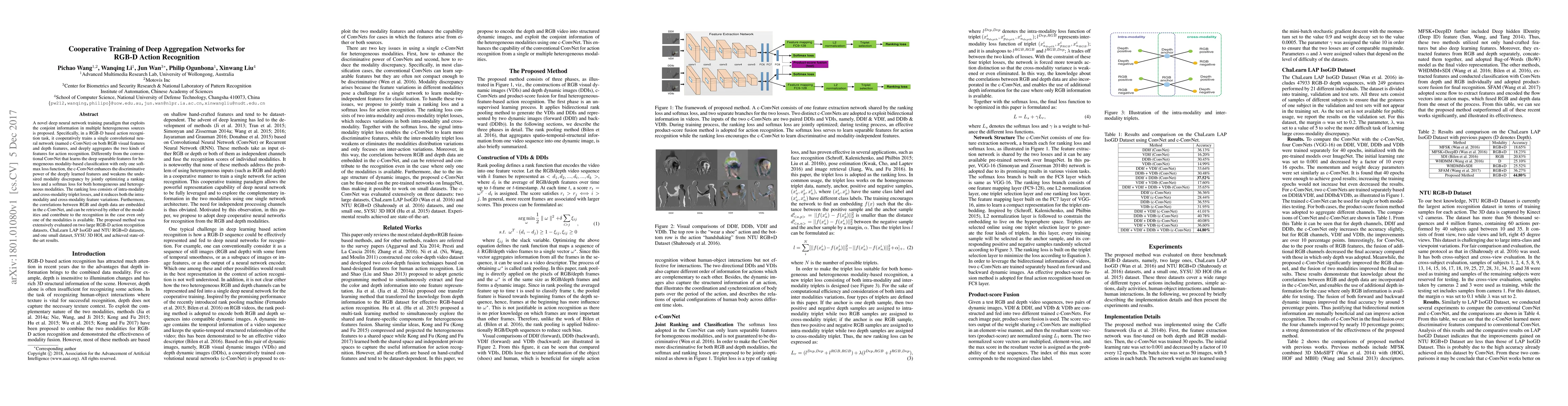 This paper proposes a cooperative training paradigm for a convolutional neural network (c-ConvNet) that jointly optimizes RGB and depth features for RGB-D action recognition, using both ranking and softmax losses to enhance feature discriminative power. The method achieves state-of-the-art results on multiple datasets by deeply aggregating and embedding correlations between RGB and depth modalities.
