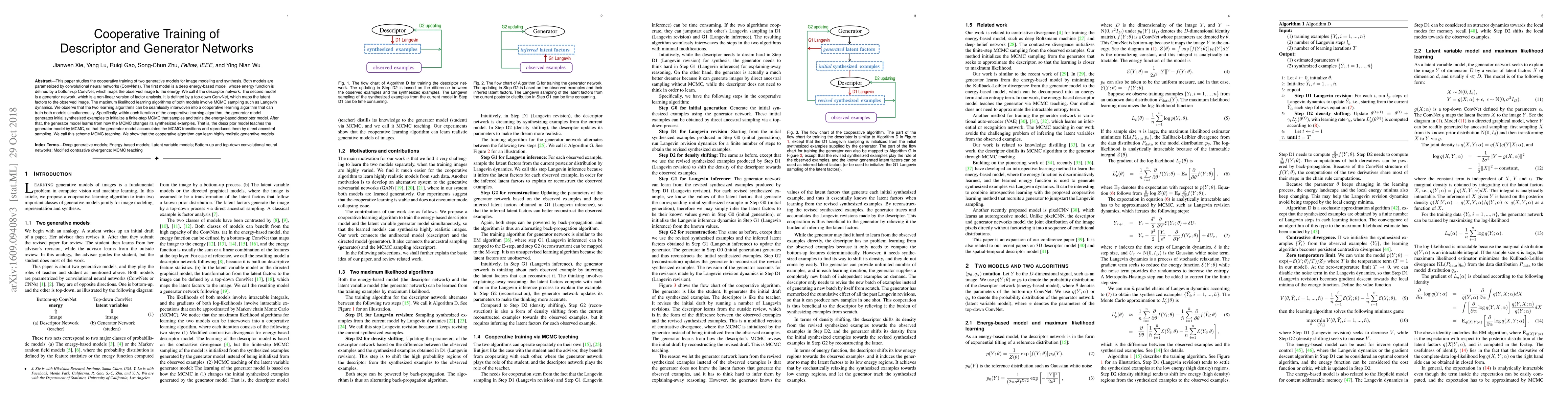 This paper proposes a cooperative training method for two convolutional neural networks: a descriptor network and a generator network, to improve image modeling and synthesis. The descriptor network teaches the generator network through MCMC teaching, leading to highly realistic generative models.