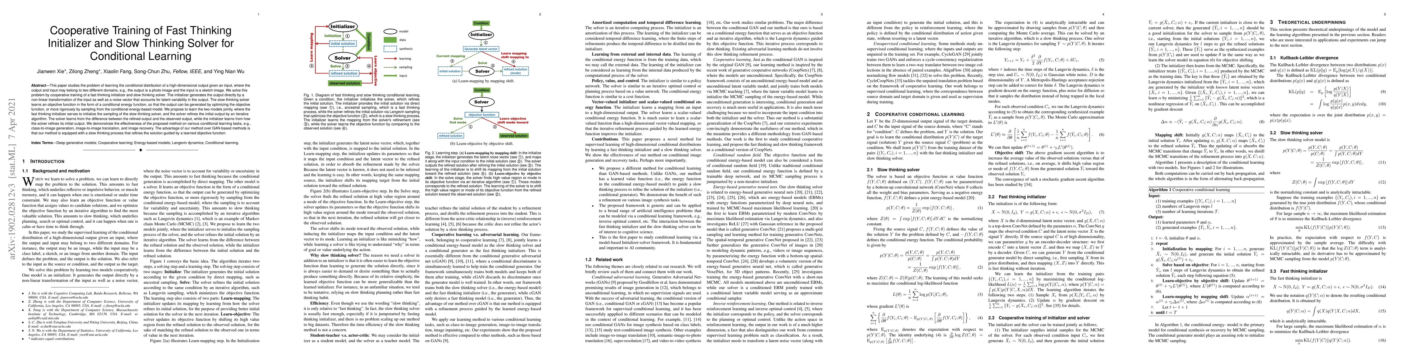 This paper introduces a cooperative training framework that uses a fast thinking initializer and a slow thinking solver to learn conditional distributions across different domains, like sketch-to-photo transformations. The initializer quickly generates outputs, while the solver refines them through an iterative optimization process, demonstrating effectiveness in tasks like image generation and translation.