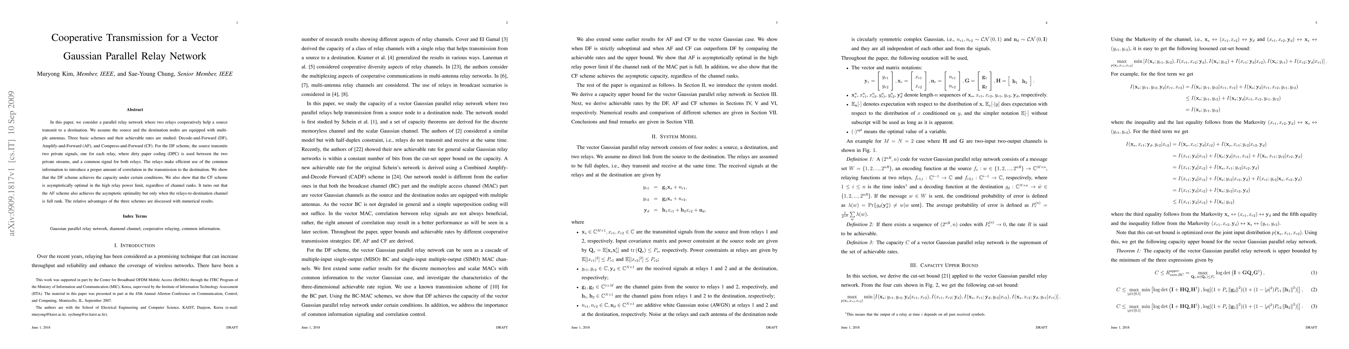 In this paper, we consider a parallel relay network where two relays cooperatively help a source transmit to a destination. We assume the source and the destination nodes are equipped with multiple antennas. Three basic schemes and their achievable rates are studied: Decode-and-Forward (DF), Amplify-and-Forward (AF), and Compress-and-Forward (CF). For the DF scheme, the source transmits two private signals, one for each relay, where dirty paper coding (DPC) is used between the two private streams, and a common signal for both relays. The relays make efficient use of the common information to introduce a proper amount of correlation in the transmission to the destination. We show that the DF scheme achieves the capacity under certain conditions. We also show that the CF scheme is asymptotically optimal in the high relay power limit, regardless of channel ranks. It turns out that the AF scheme also achieves the asymptotic optimality but only when the relays-to-destination channel is full rank. The relative advantages of the three schemes are discussed with numerical results.