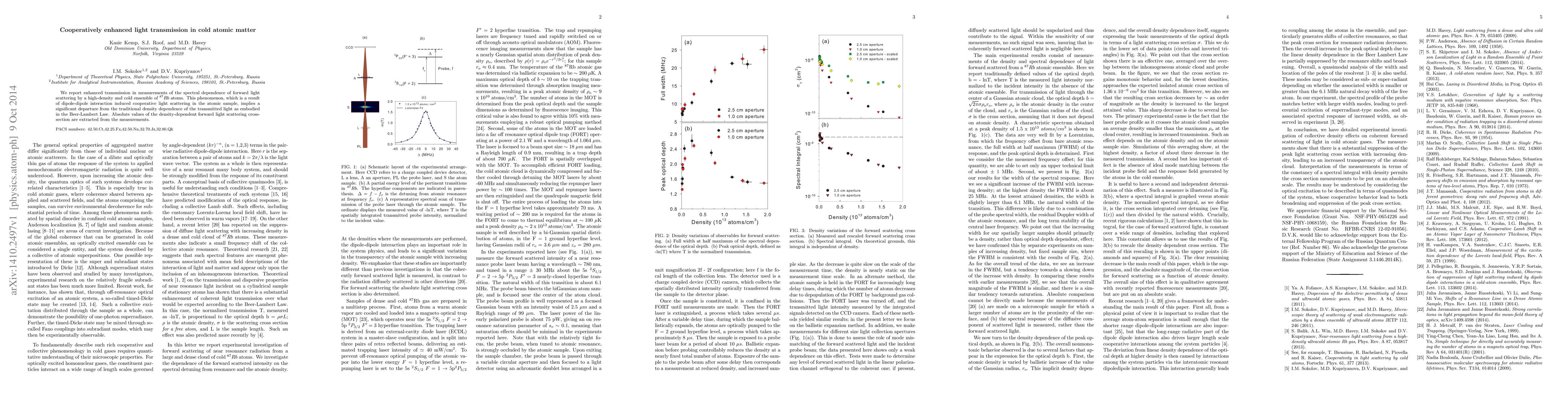 This study reveals enhanced light transmission through a high-density, cold ensemble of 87Rb atoms due to cooperative light scattering driven by dipole-dipole interactions, significantly deviating from the Beer-Lambert Law. The research extracts the density-dependent forward light scattering cross-section values from the measurements.