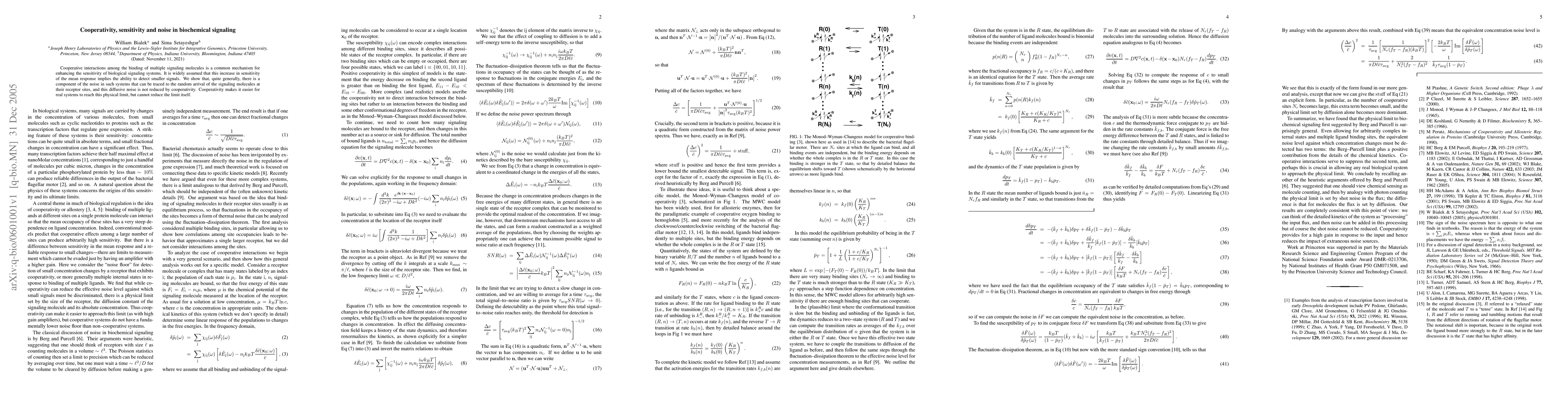 Cooperativity in biochemical signaling can increase sensitivity but does not reduce noise from random molecule arrivals at receptor sites. This limits the system's ability to detect smaller signals.